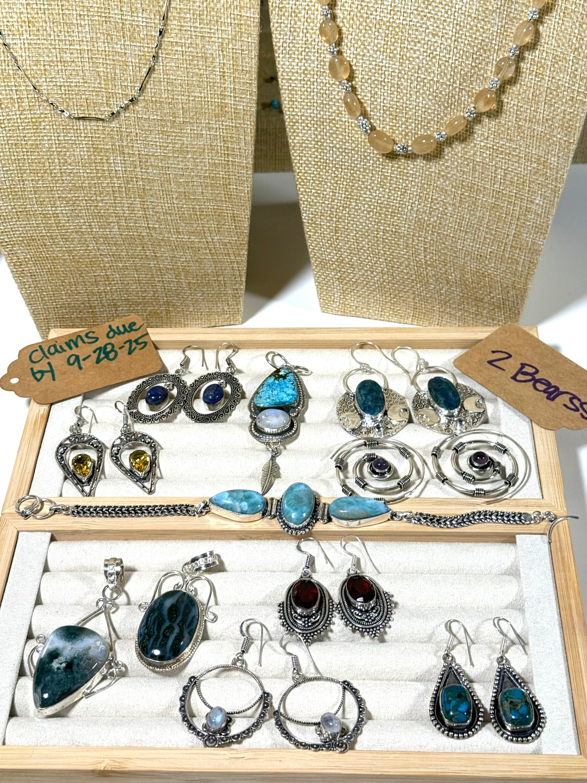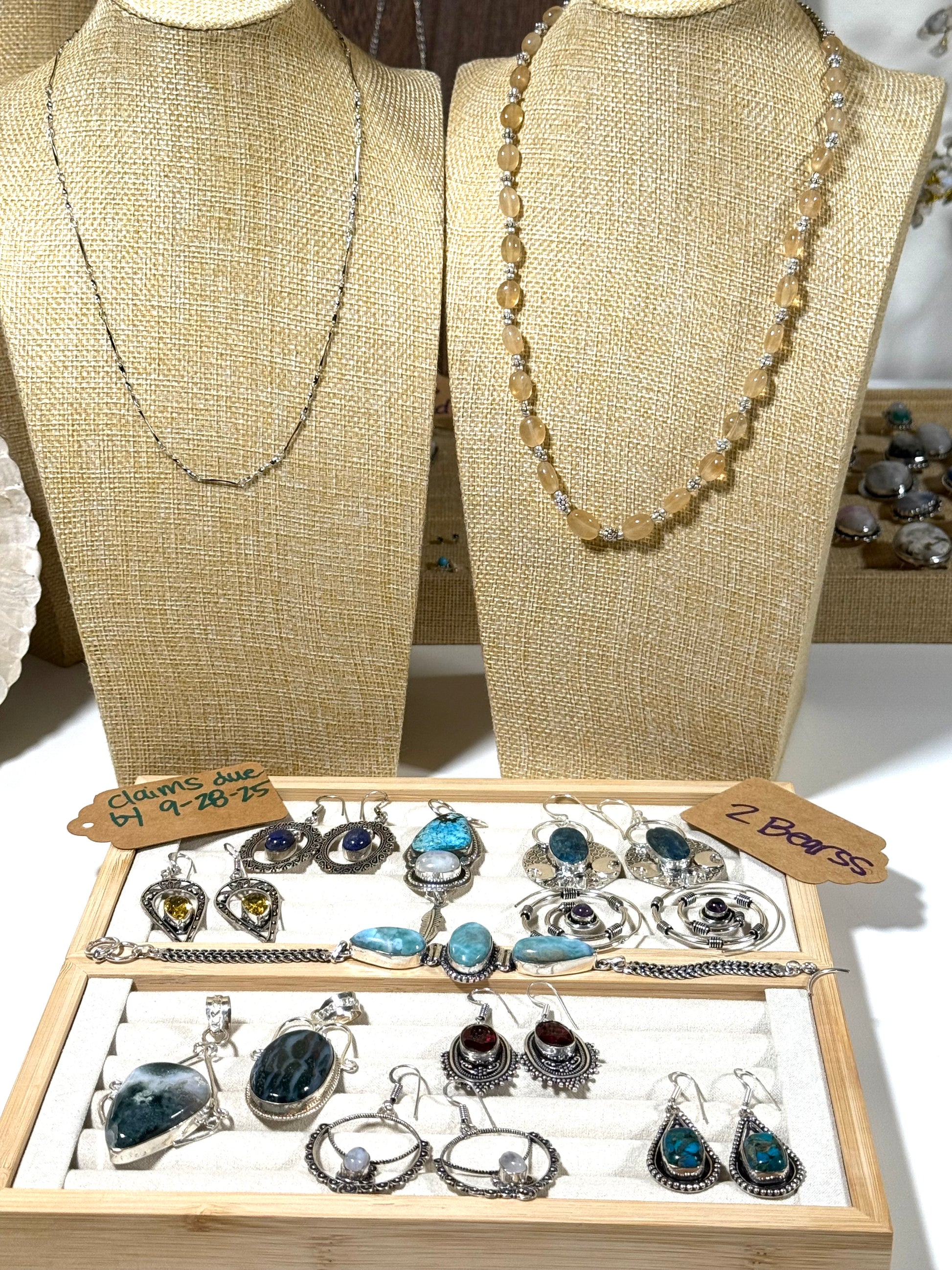 Carnelian beads (20), silver chain (3), lapis hoops (16), turquoise pendant (19), apatite dangles (16), citrine dangles (13), amethyst spiral (14), Larimar bracelet (19), Indian moss (16), garnet dangles (14), moonstone hoops (16), chrysocolla dangles (14). 9/25 solid silver chains x 3 pictured in another post (9).
