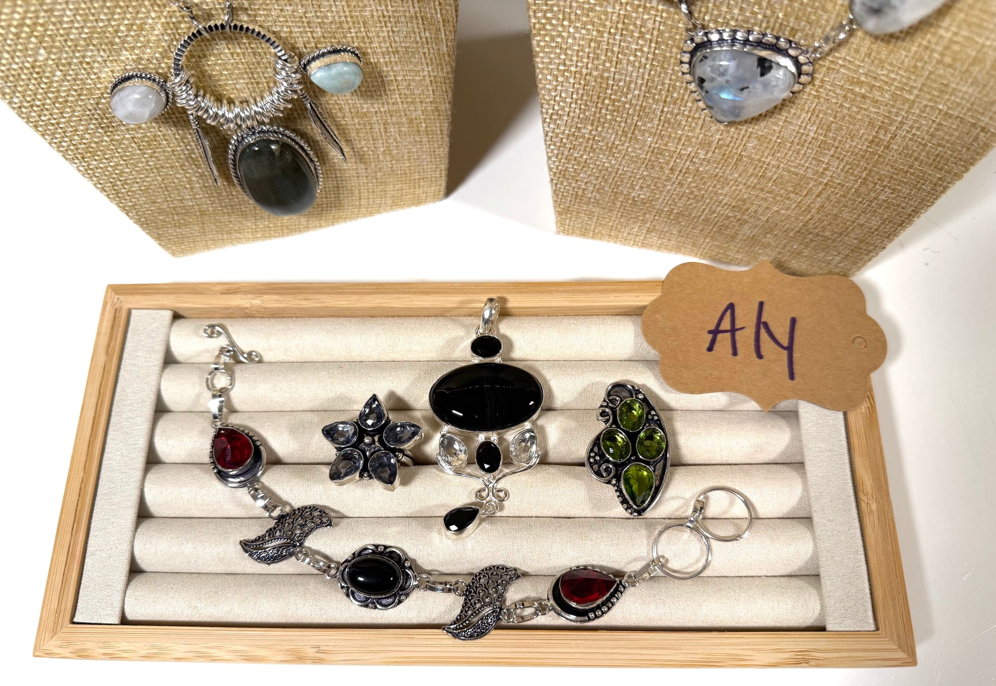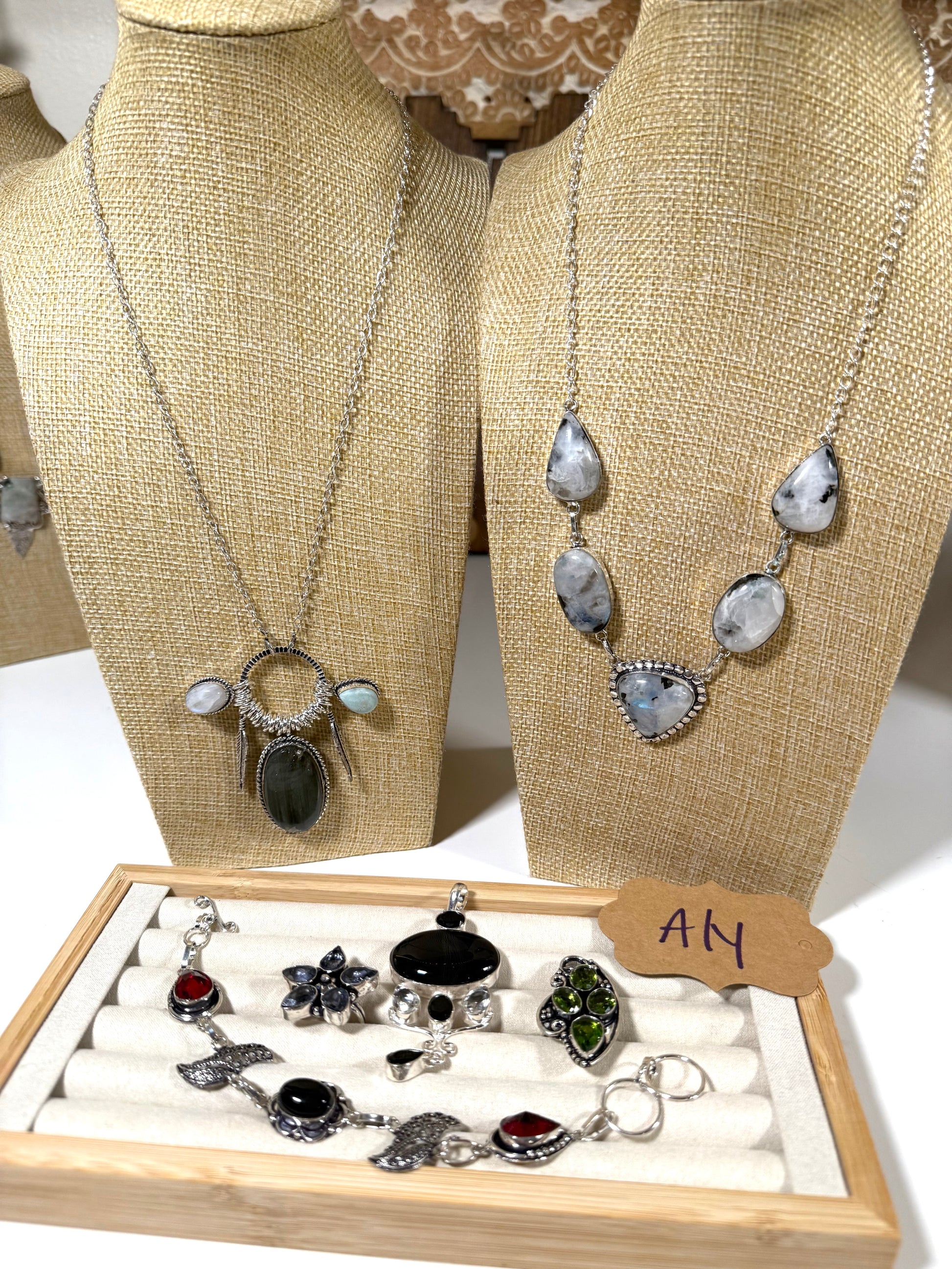 Lab feather necklace (15), rainbow ms necklace (15), tanzanite ring (14), onyx pendant (12), peridot ring (14), onyx garnet bracelet (13).