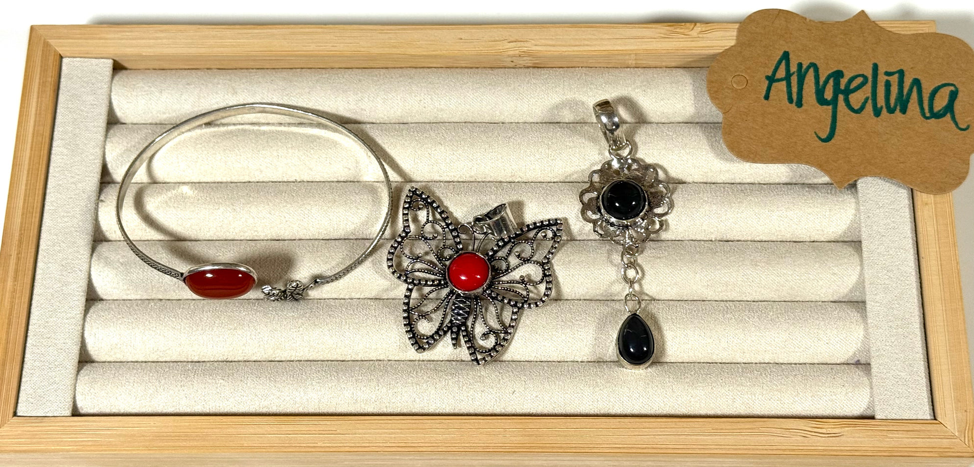 Carnelian bangle (10), butterfly red coral (5), black onyx (5).
