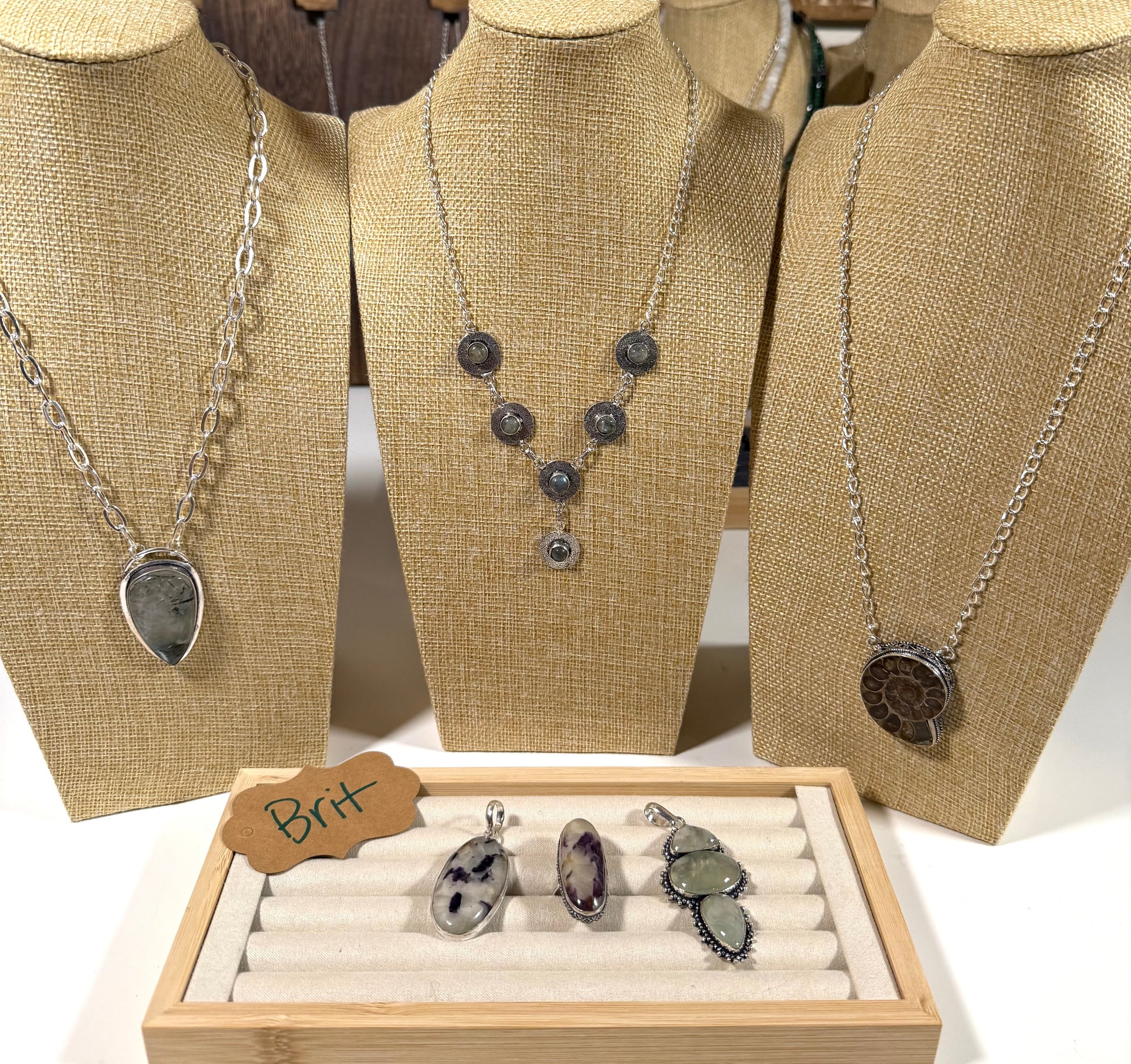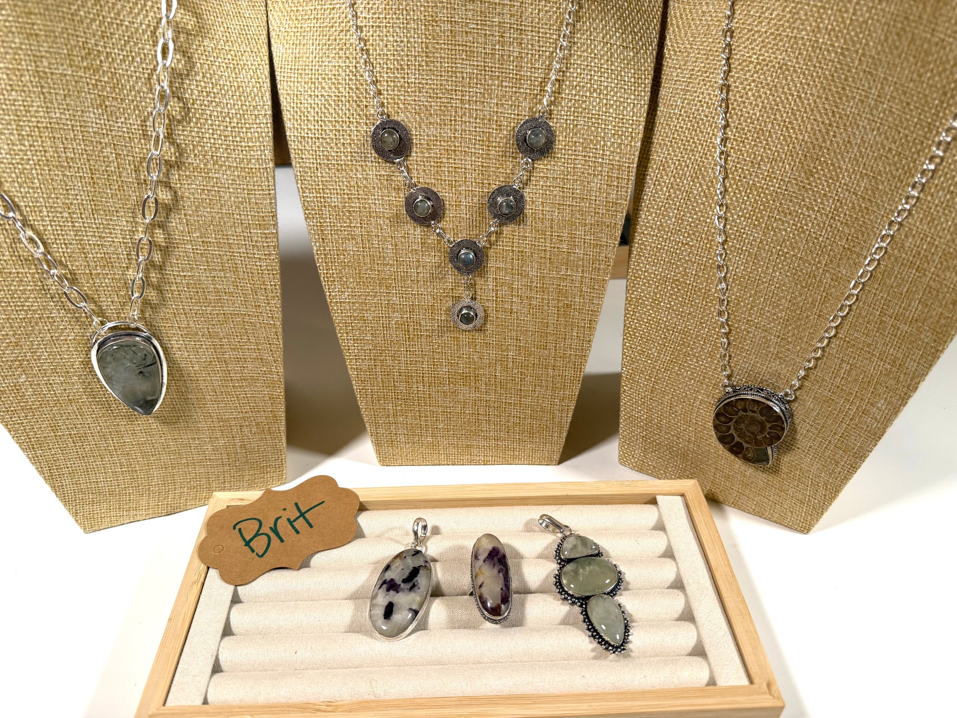 Prehnite necklace (14), lab necklace (14), ammonite necklace (19), kammererite pendant (13), prehnite pendant (13).