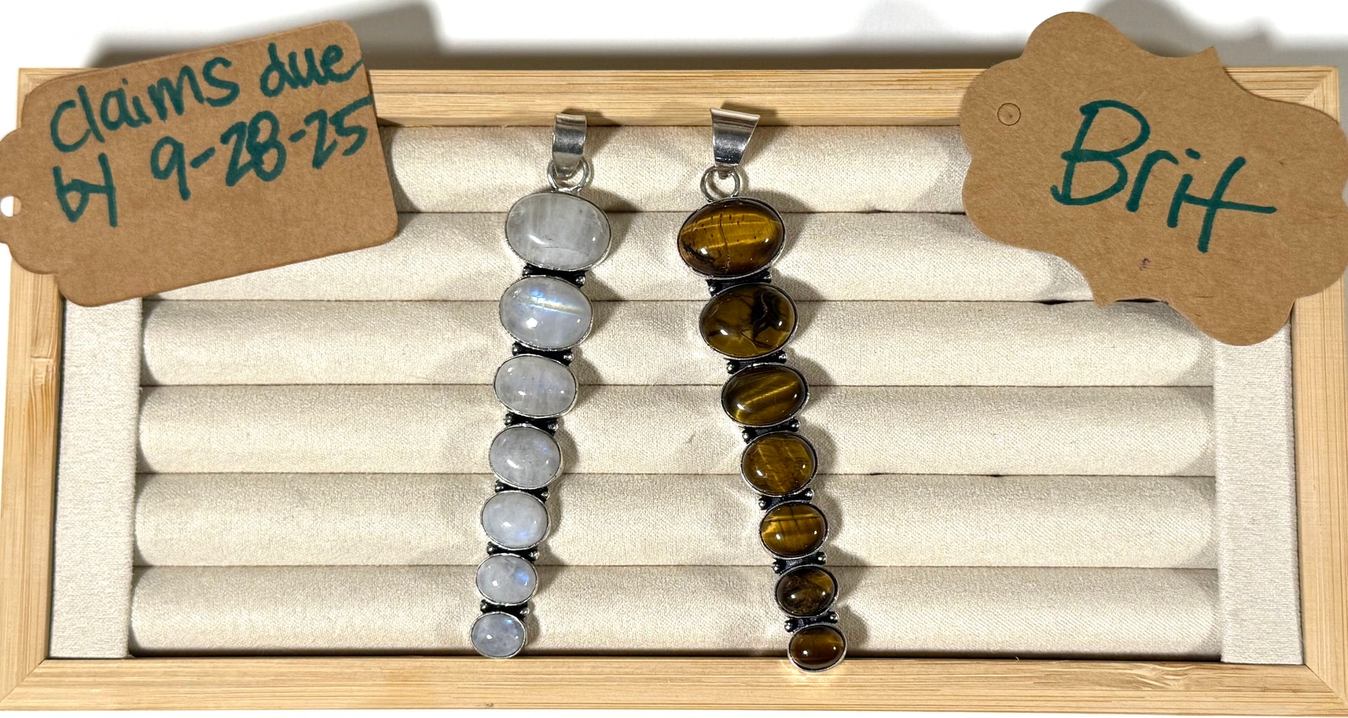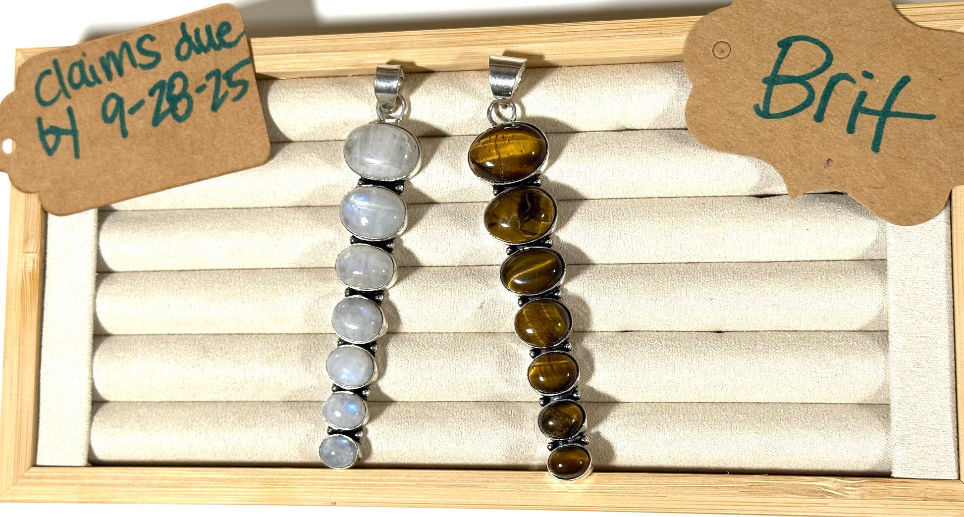 Moonstone and tiger’s eye pendants, solid silver (19 ea).