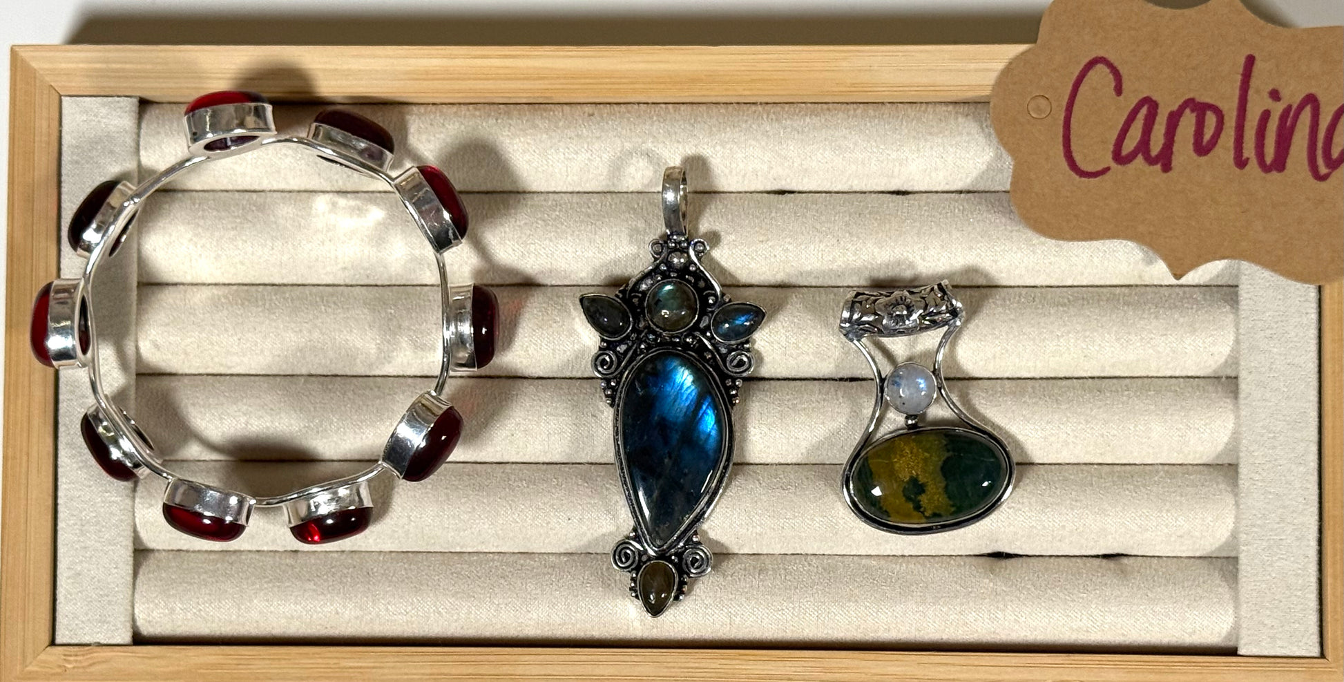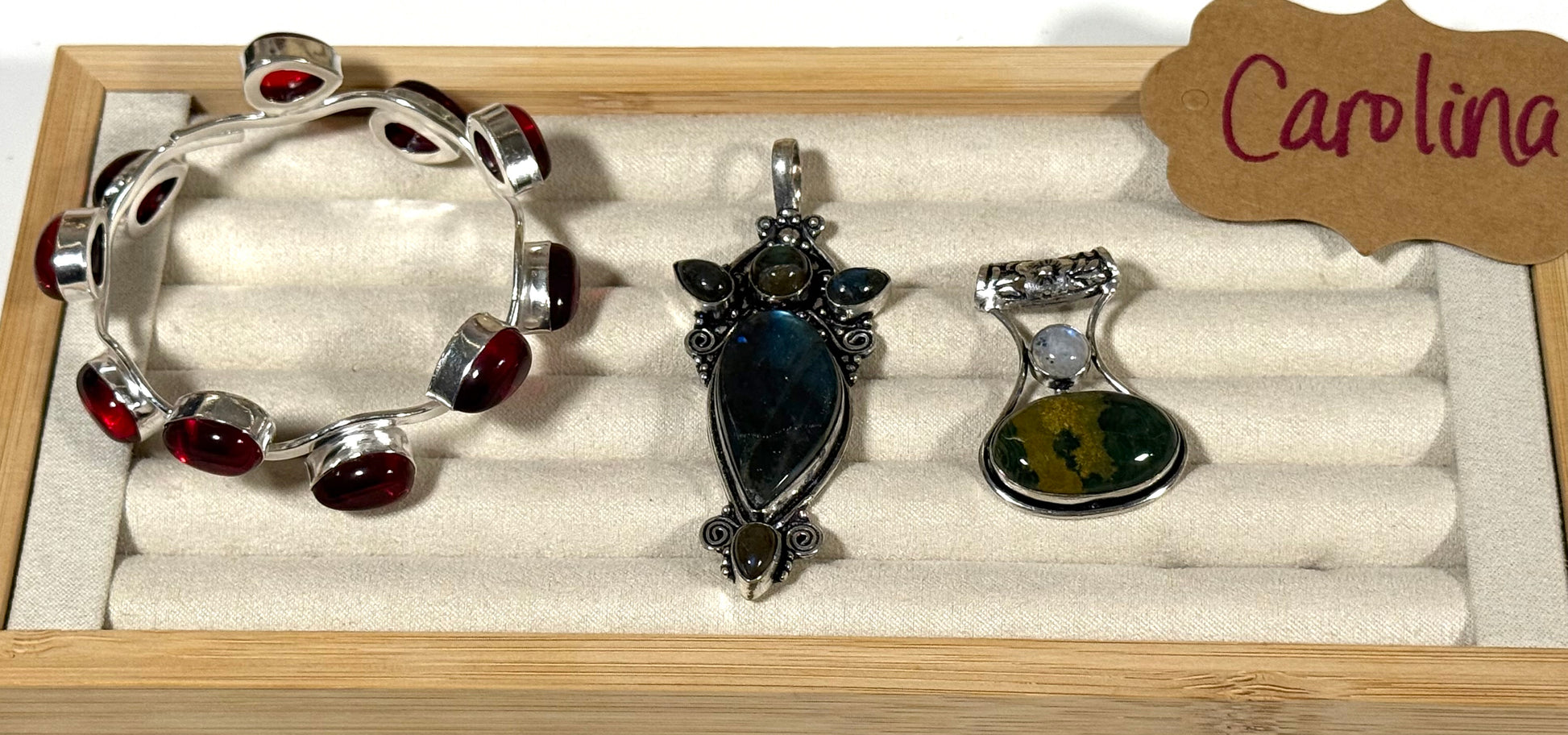 Garnet solid ss cuff (22), labradorite pendant (16), oj pendant (13).