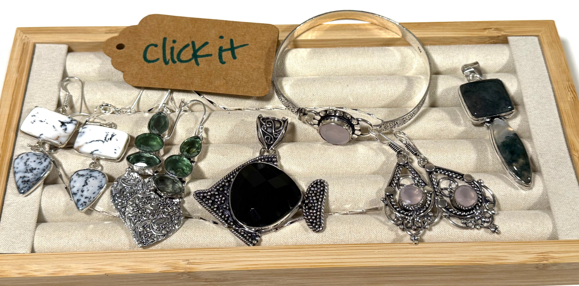 Tsavorite dangles (16), dendritic dangles (14), onyx pendant (12), rose quartz bangle (13), rose quartz dangles (14), Indian moss agate pendant (12). (3) sterling silver chain?