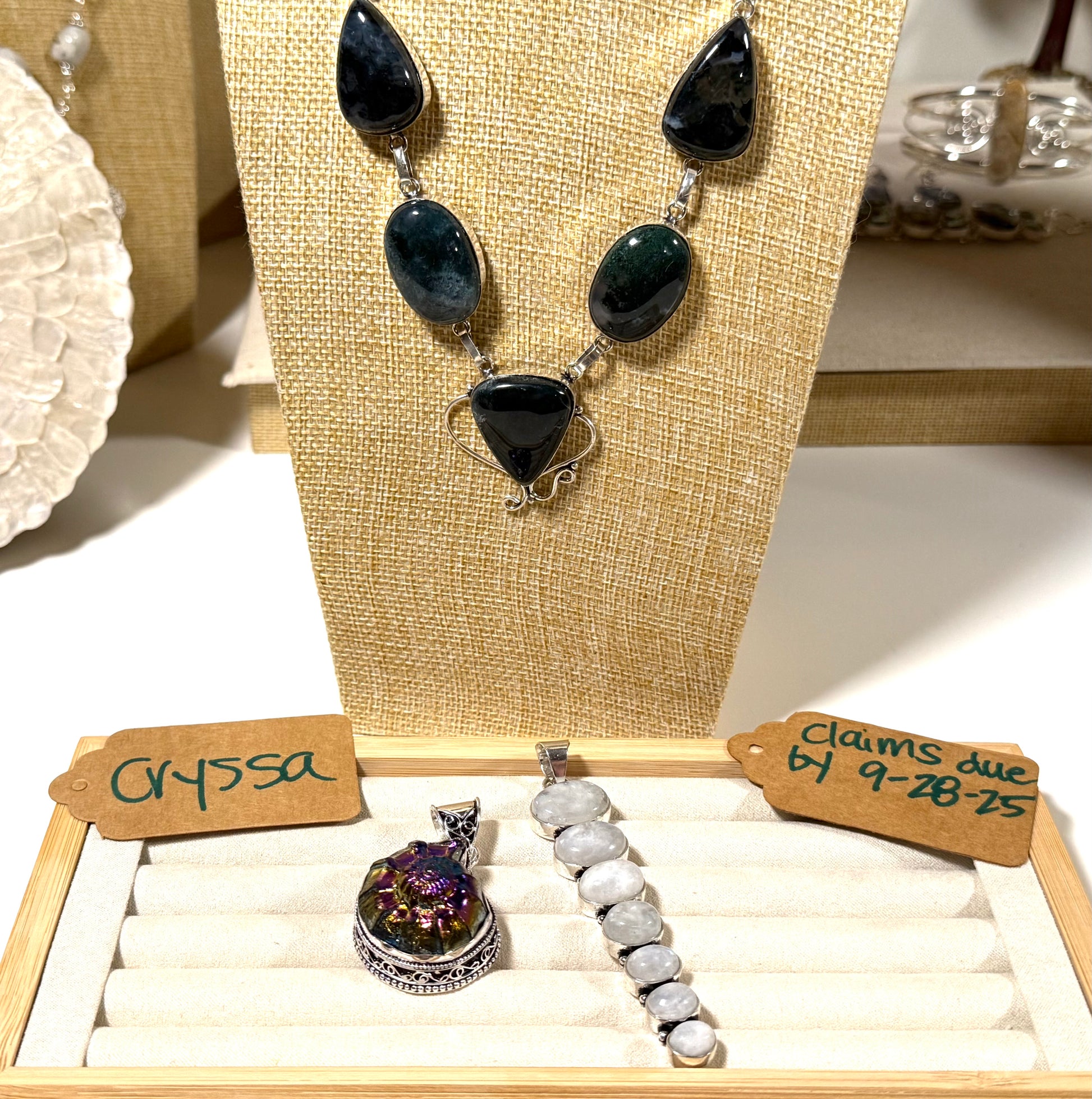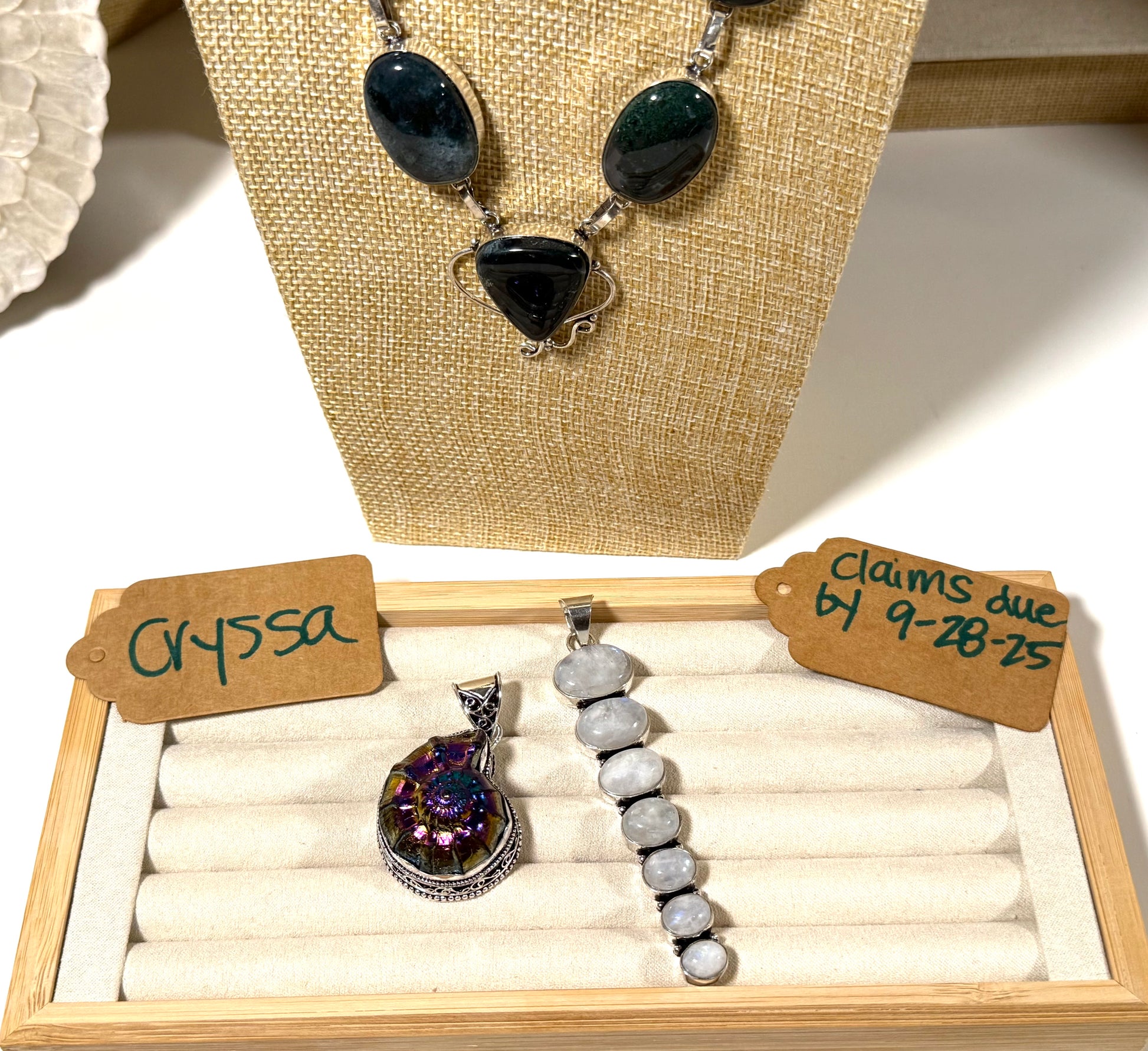 Indian moss agate necklace (16), ammonite pendant (19), moonstone pendant (19).