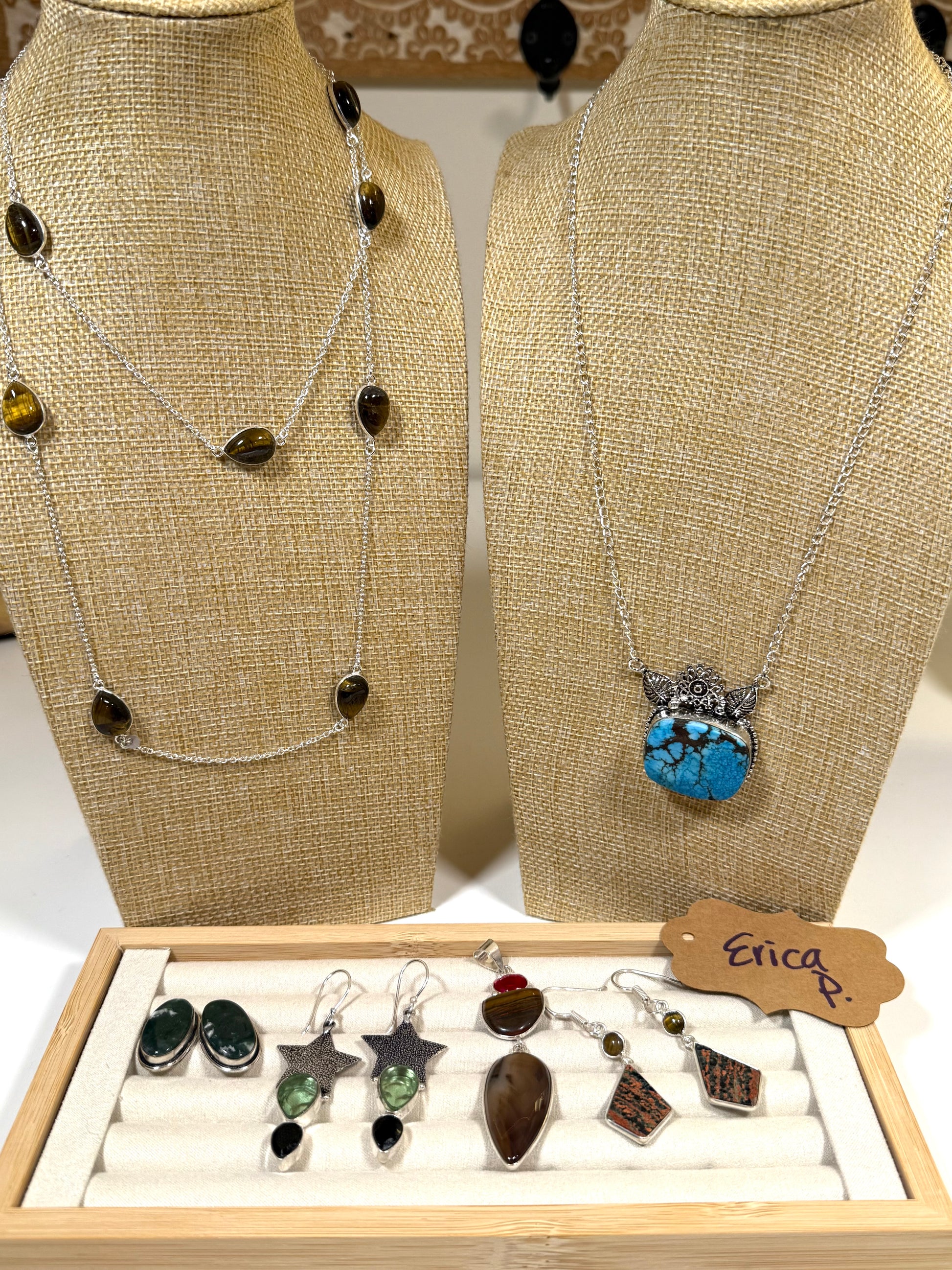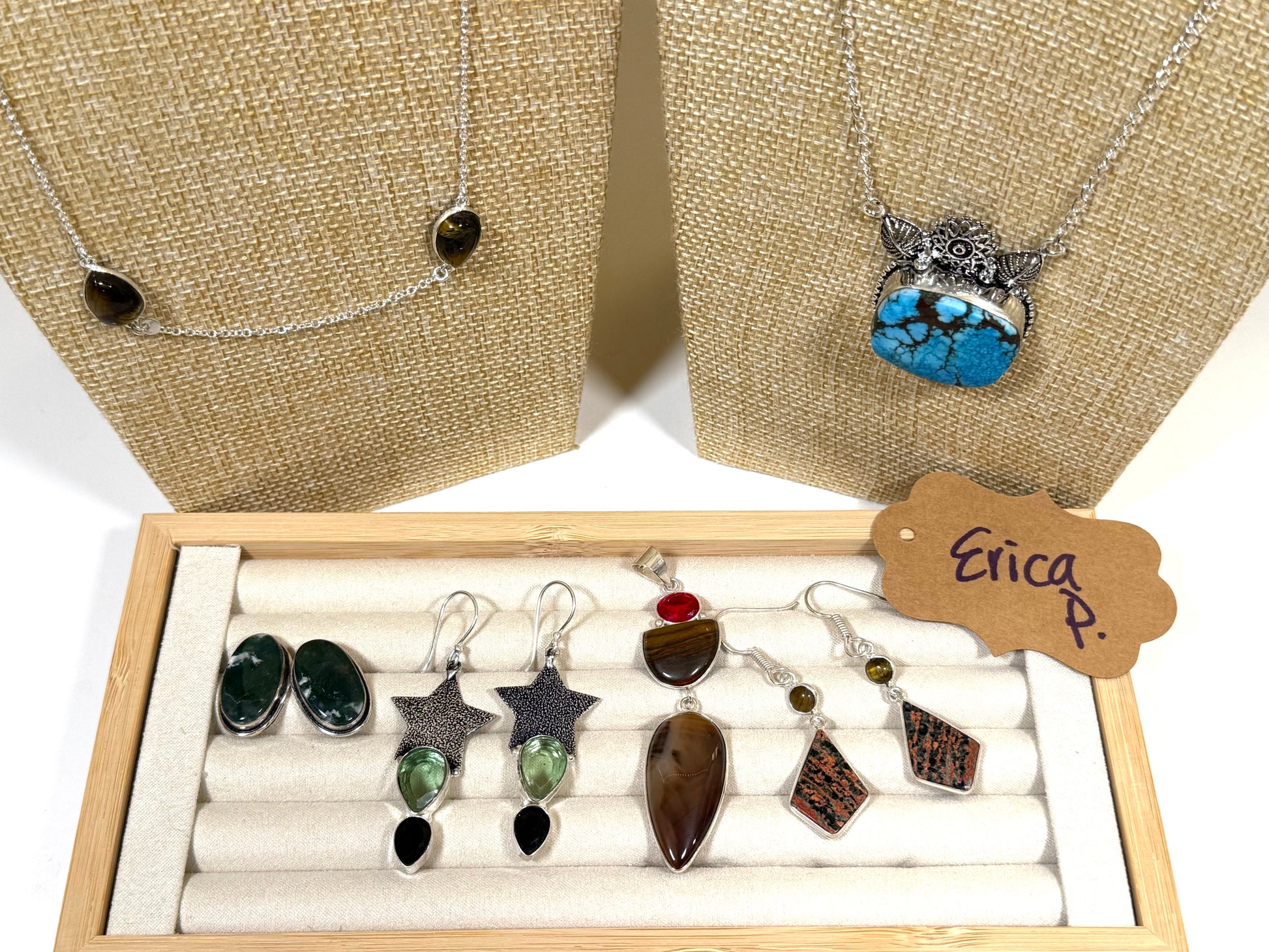 Tigers eye solid ss (15), turquoise solid ss necklace (15), moss agate studs (10), tsavorite solid ss dangles (10), agate multi pendant (12), red snowflake obsidian dangles (10).
