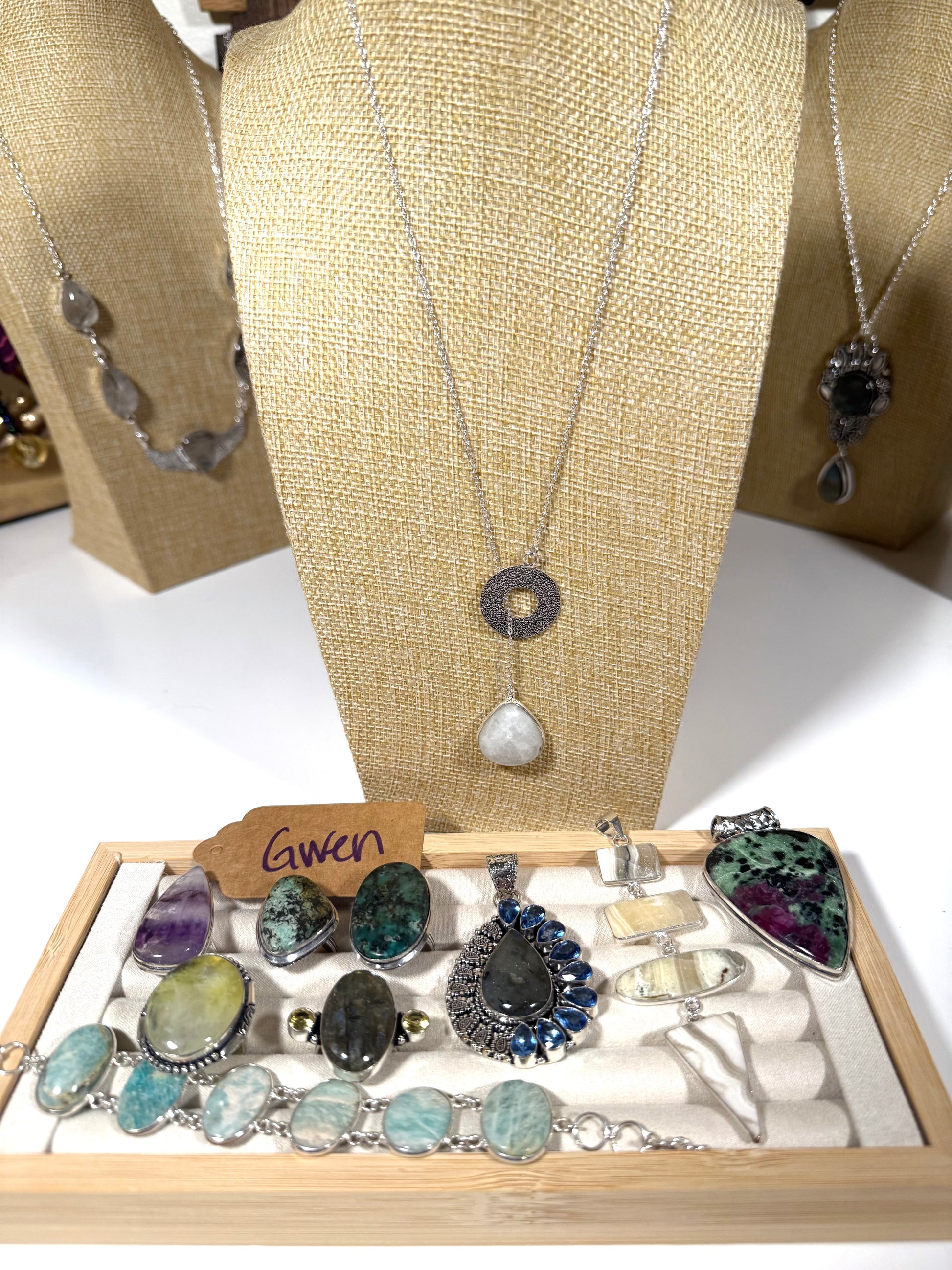 Rainbow ms necklace (16), fluorite (14), turquoise ring (14), turquoise ring (14), prehnite ring (14), lab citrine ring (14), lab topaz pendant solid ss (19), calcite pendant (18), ruby zoisite pendant (16), hememorphite bracelet (17).