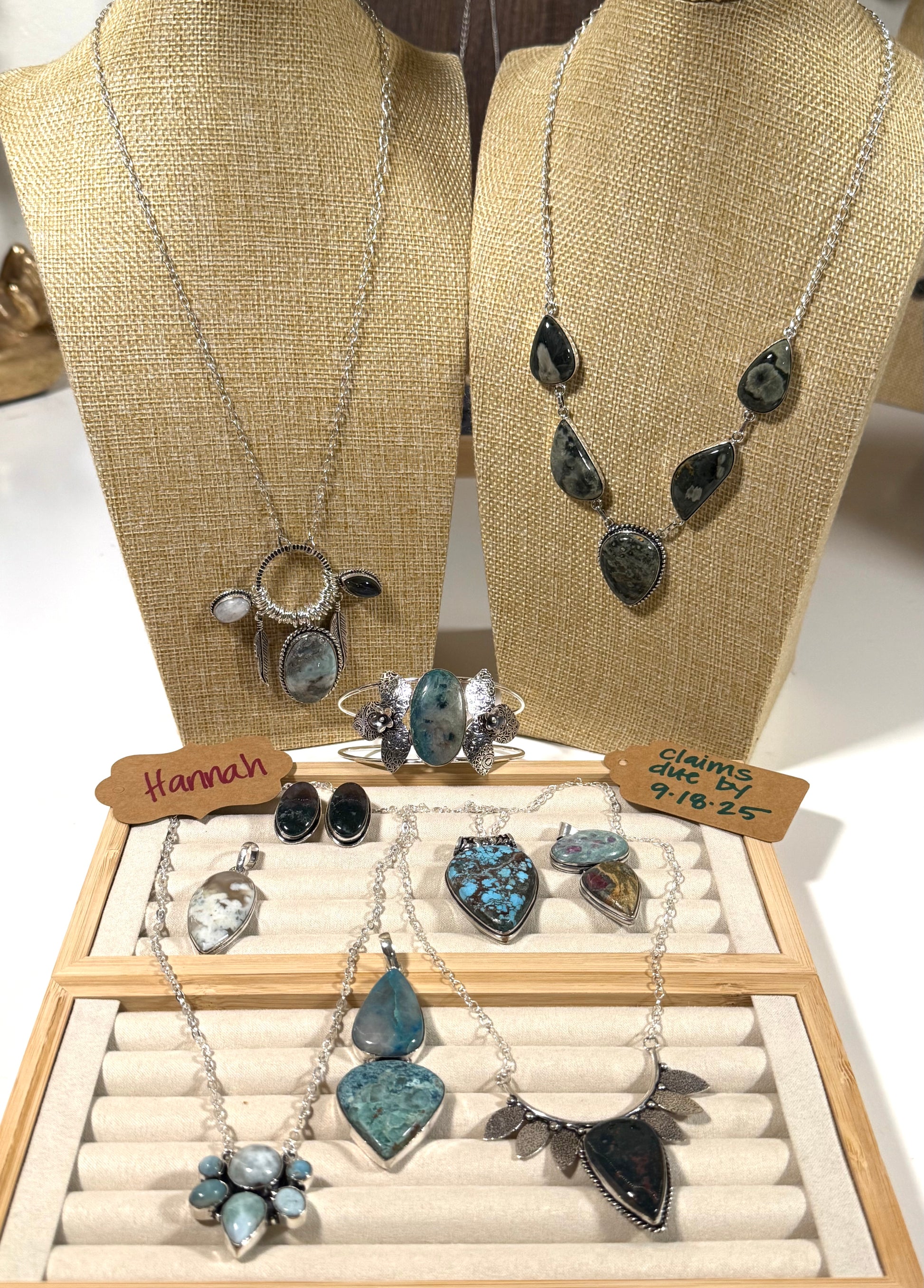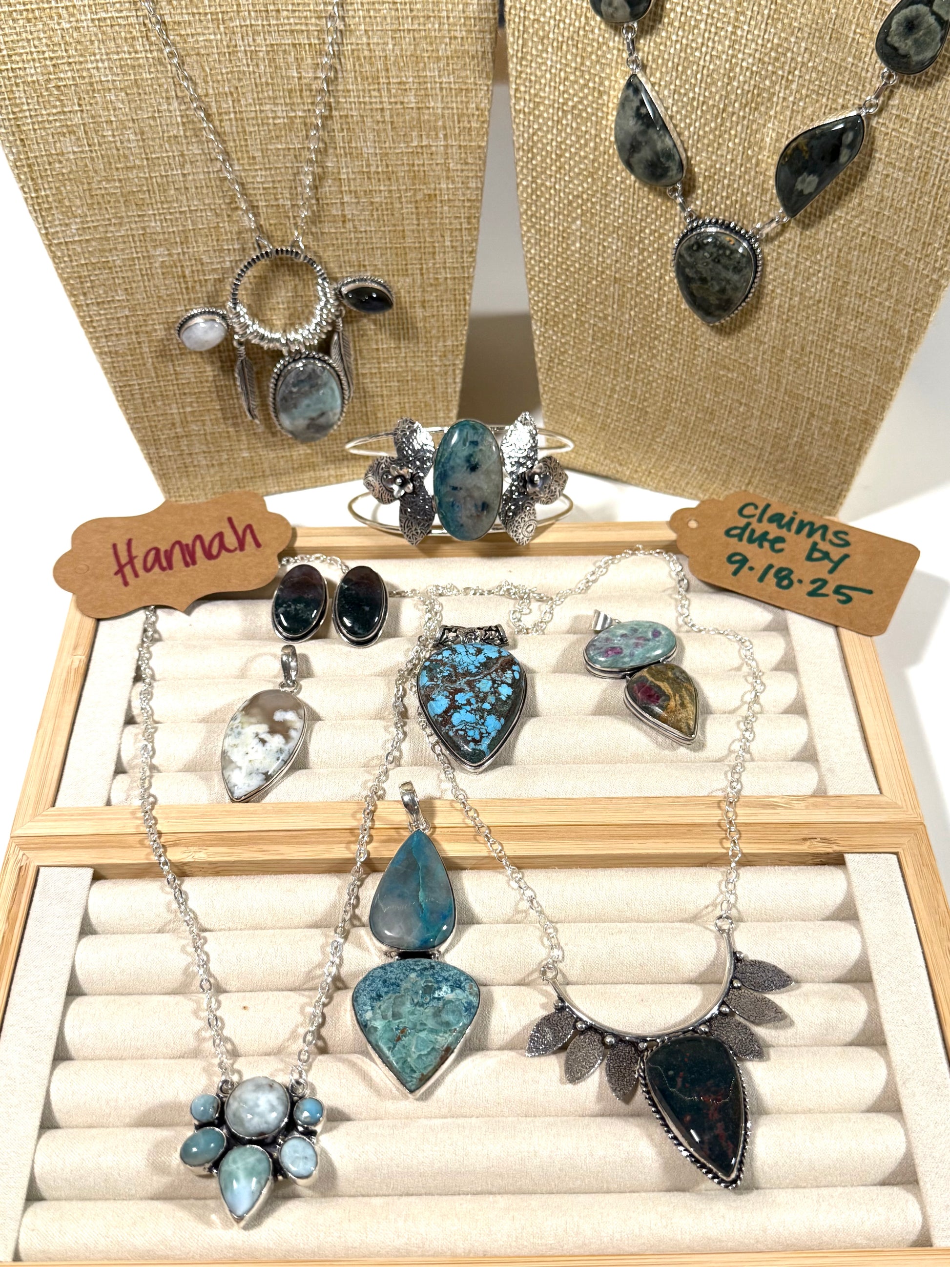 Larimar chain (20), ocean Jasper necklace (19), quantum Quattro cuff (21), bloodstone studs (13), turquoise (12), ruby fuschite 14), quantum Quattro pendant (14), Larimar necklace (14), bloodstone necklace (14).