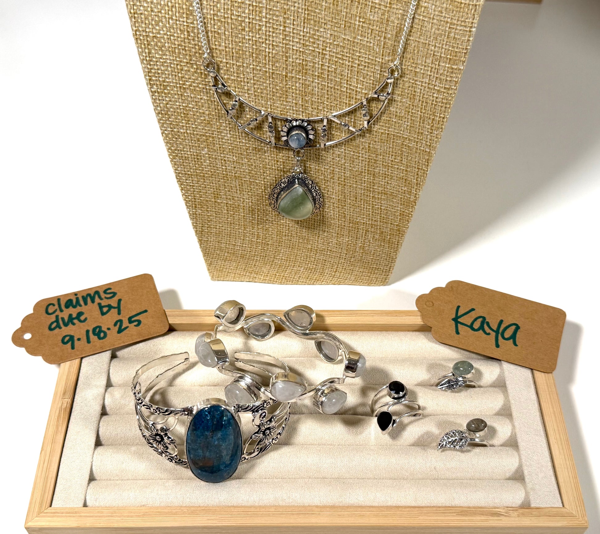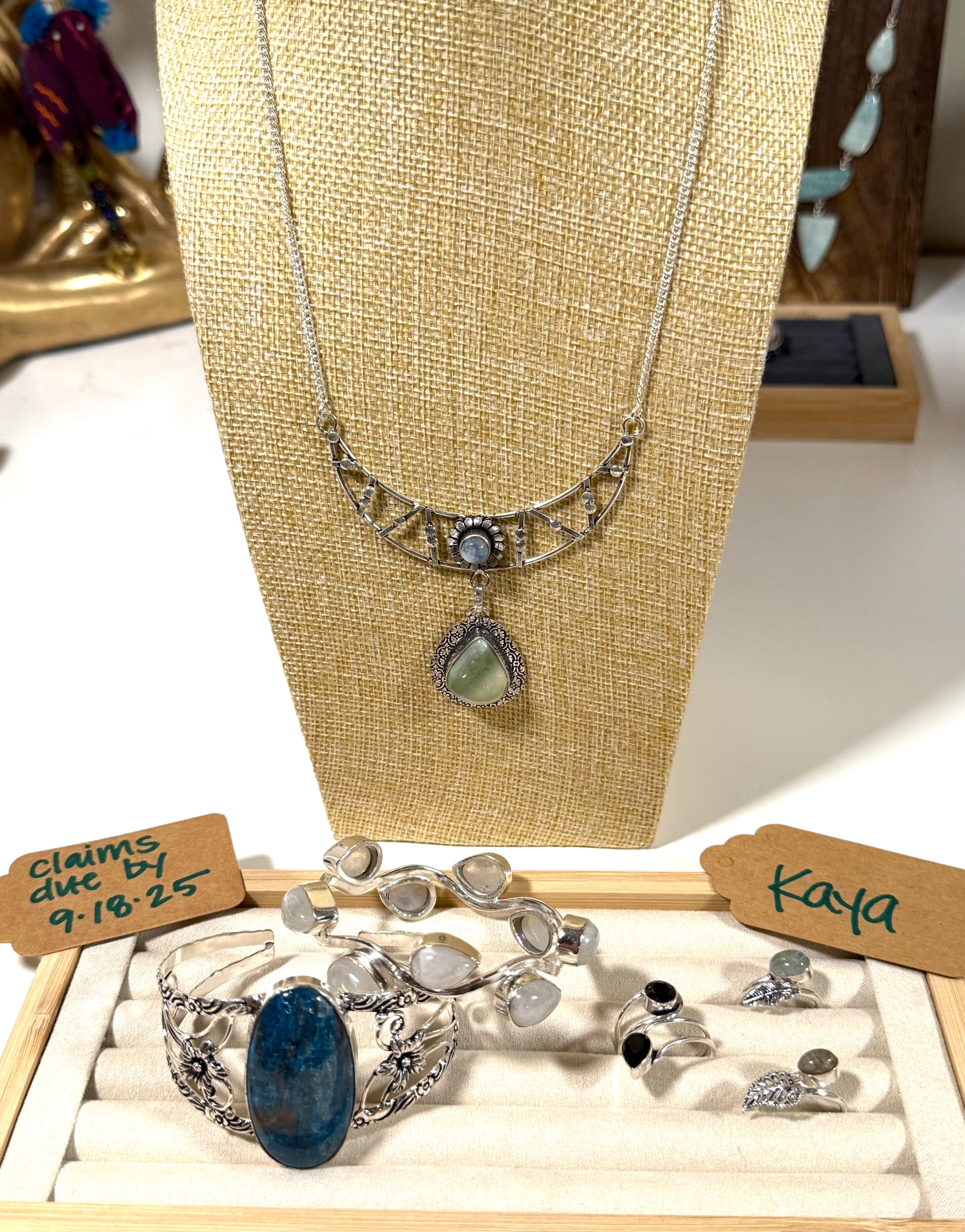Serpentine necklace (19), apatite cuff (19), rainbow moonstone cuff (21), black onyx (13), aquamarine (13), labradorite (13).