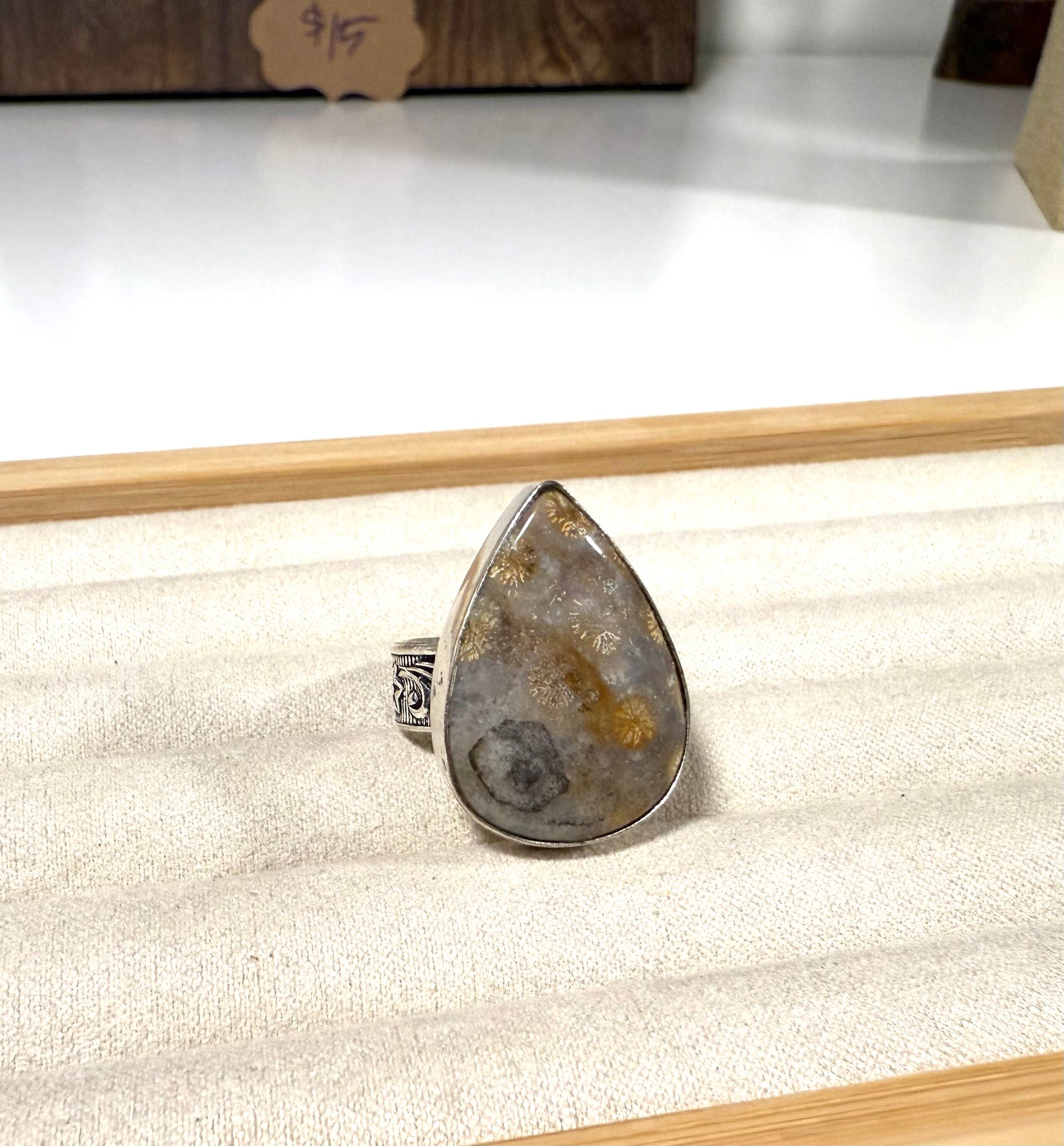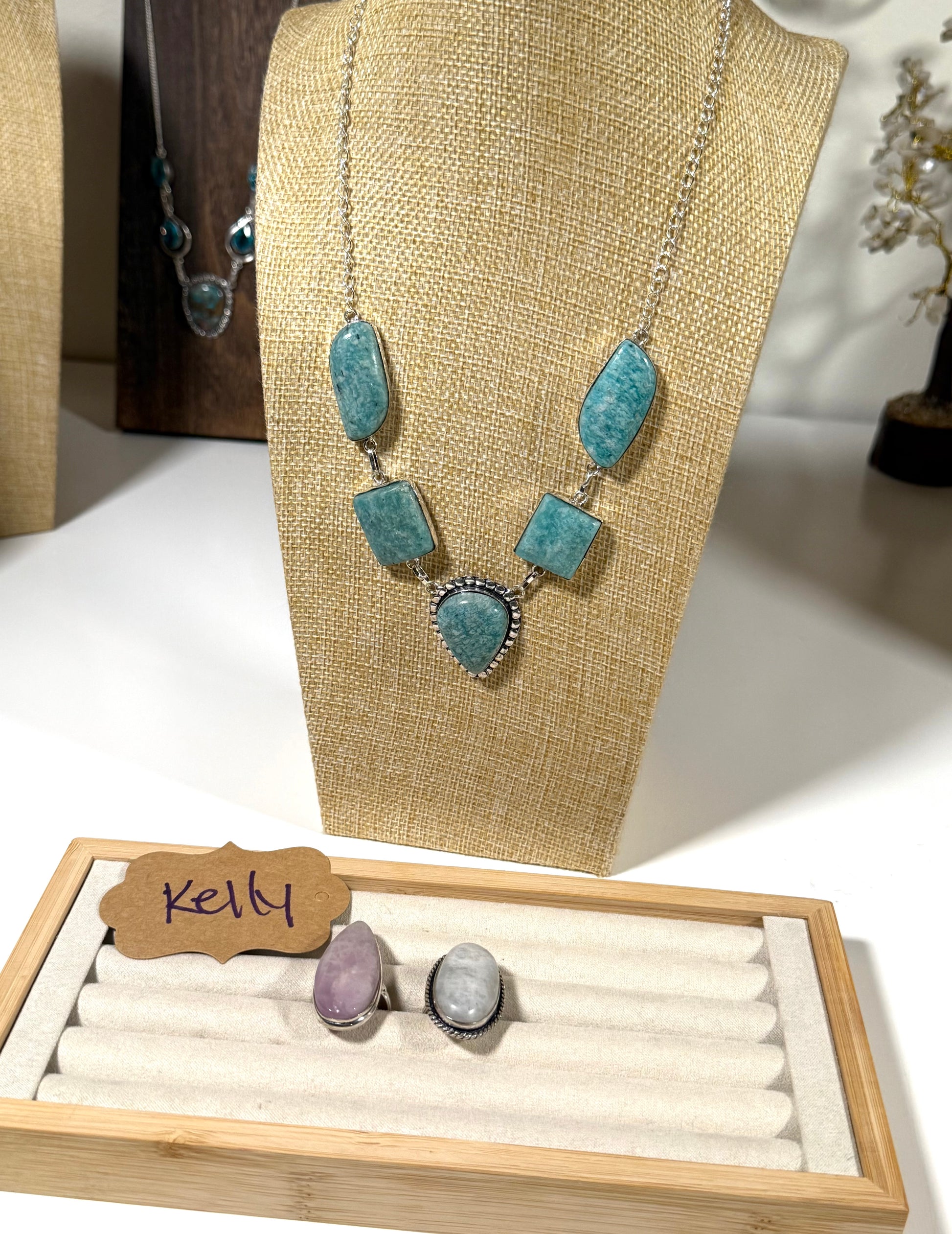 Amazonite necklace (15), lepidolite ring (14), rainbow ms ring (14). Coral fossil ring (16).