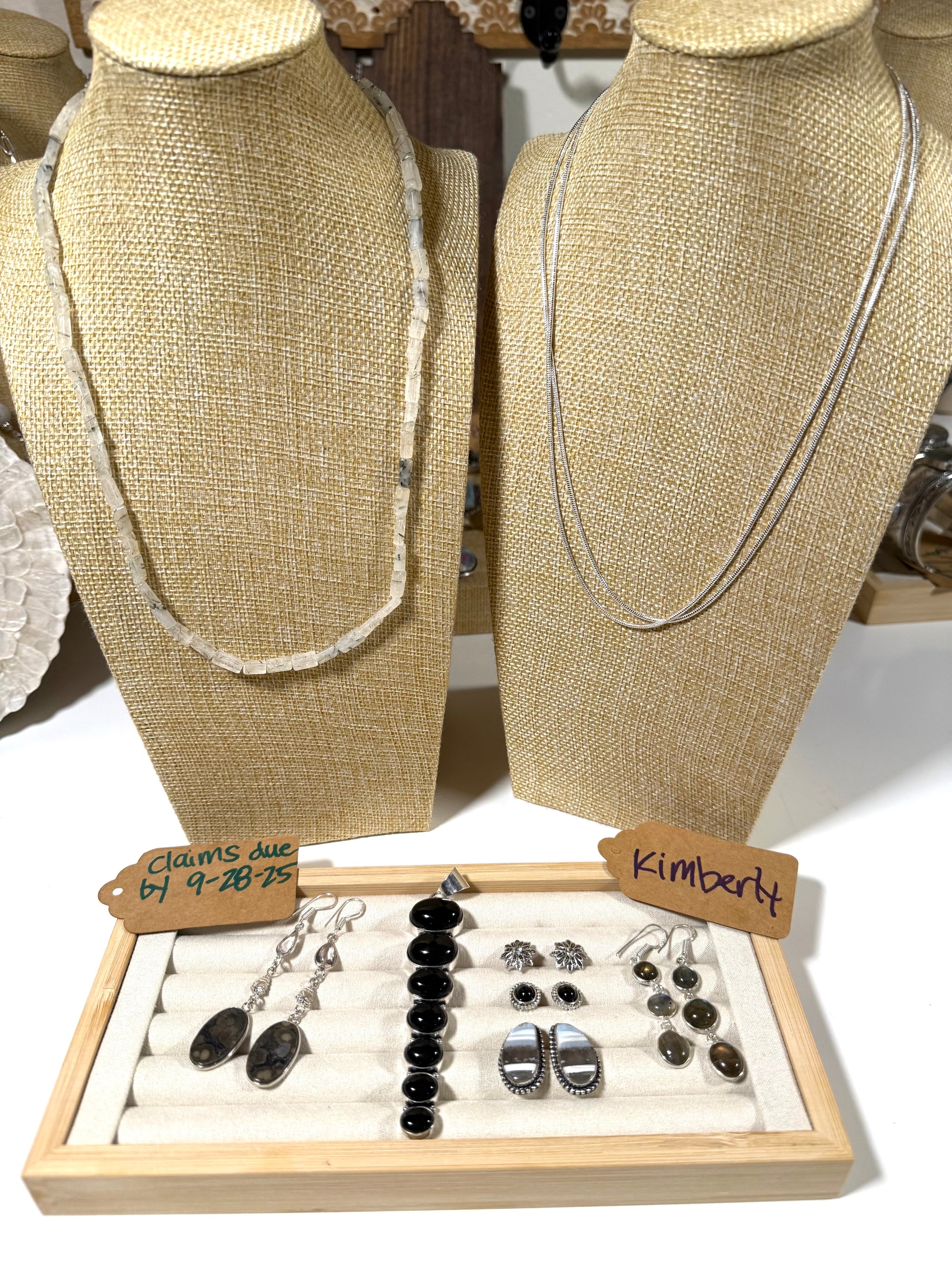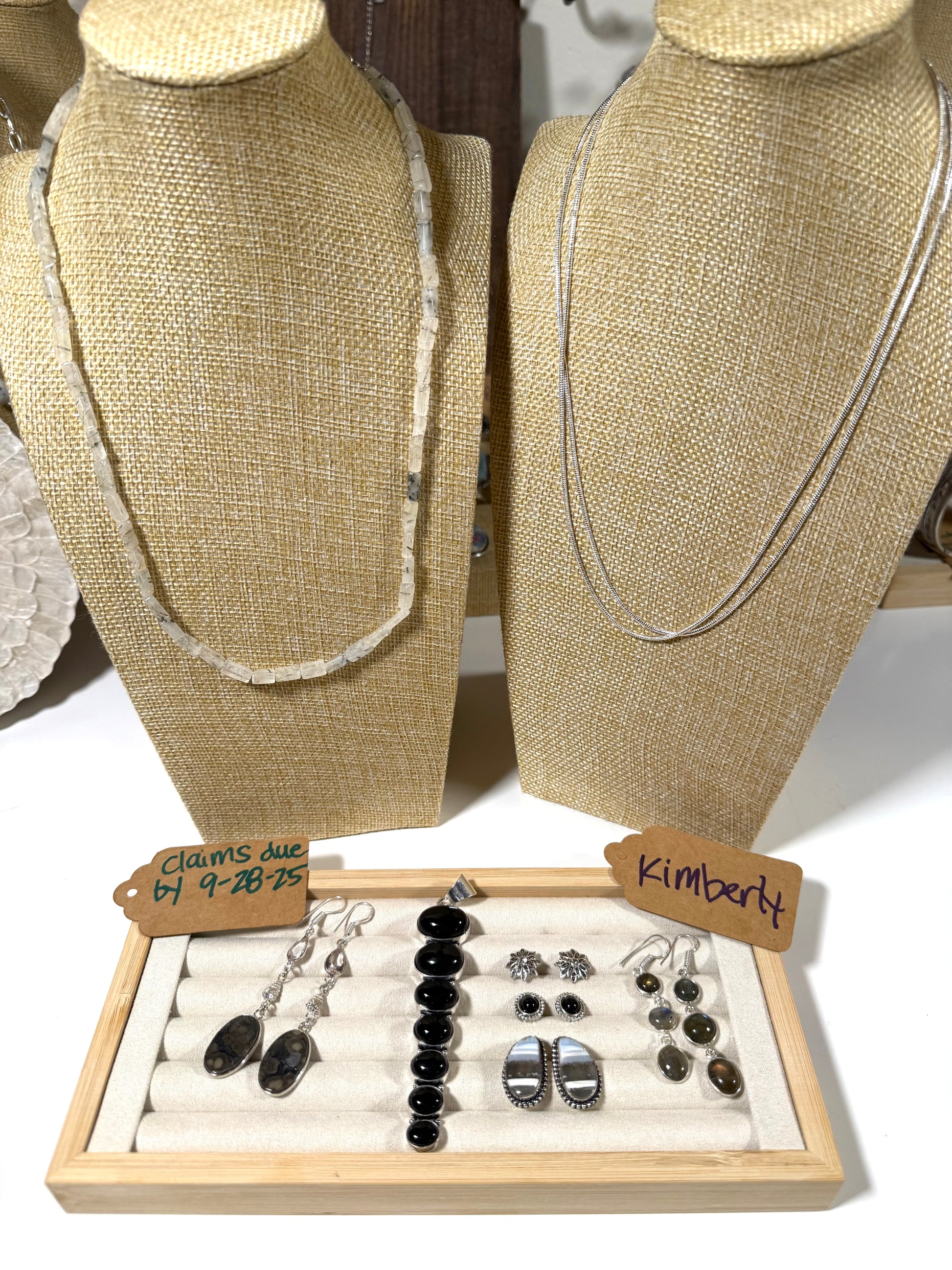 Moss beaded necklace (17), two sterling silver chains (6), boulder opal dangles (14), black onyx solid silver pendant (19), owyhee opal studs (13), two small studs (13), labradorite dangles (14).