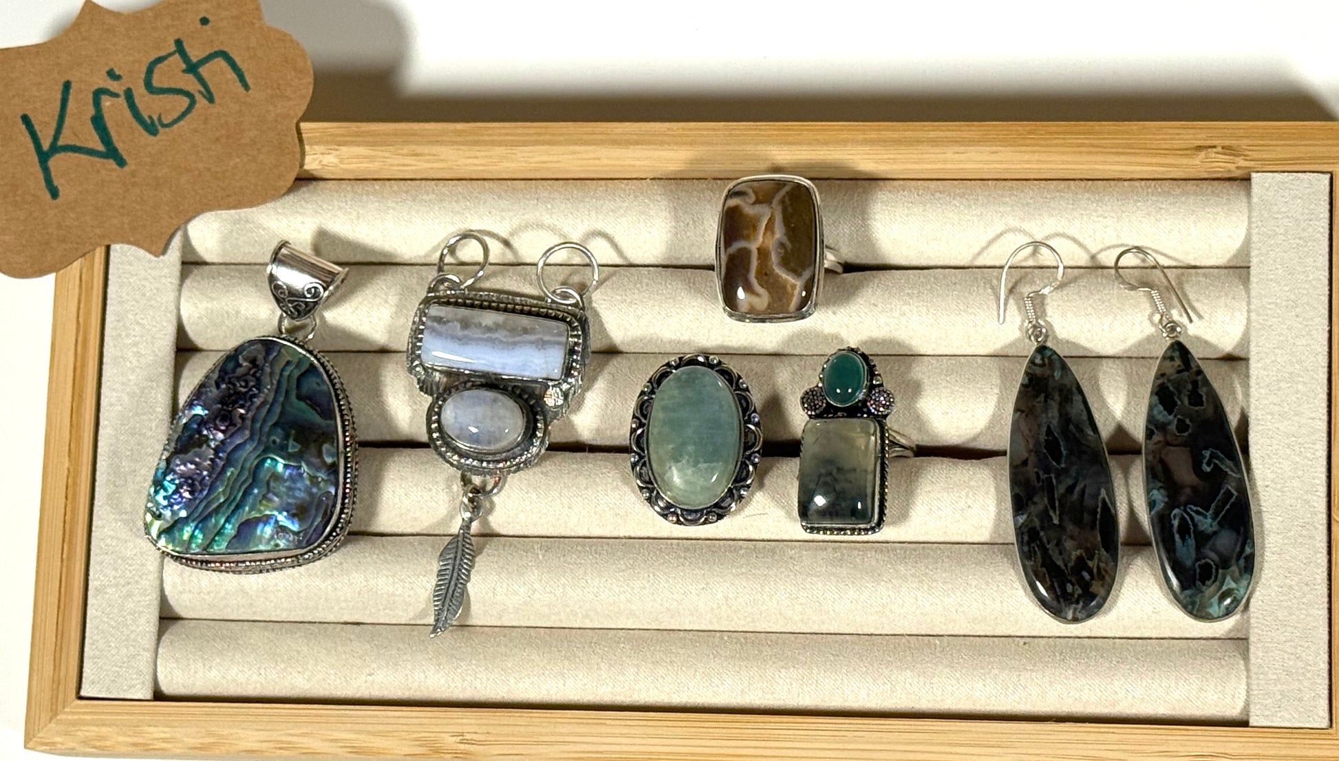 Abalone pendant solid ss (19), agate rainbow ms solid ss (19), Michigan septarian (14), aquamarine (14), moss prehnite ring (14), stick agate dangles (13).