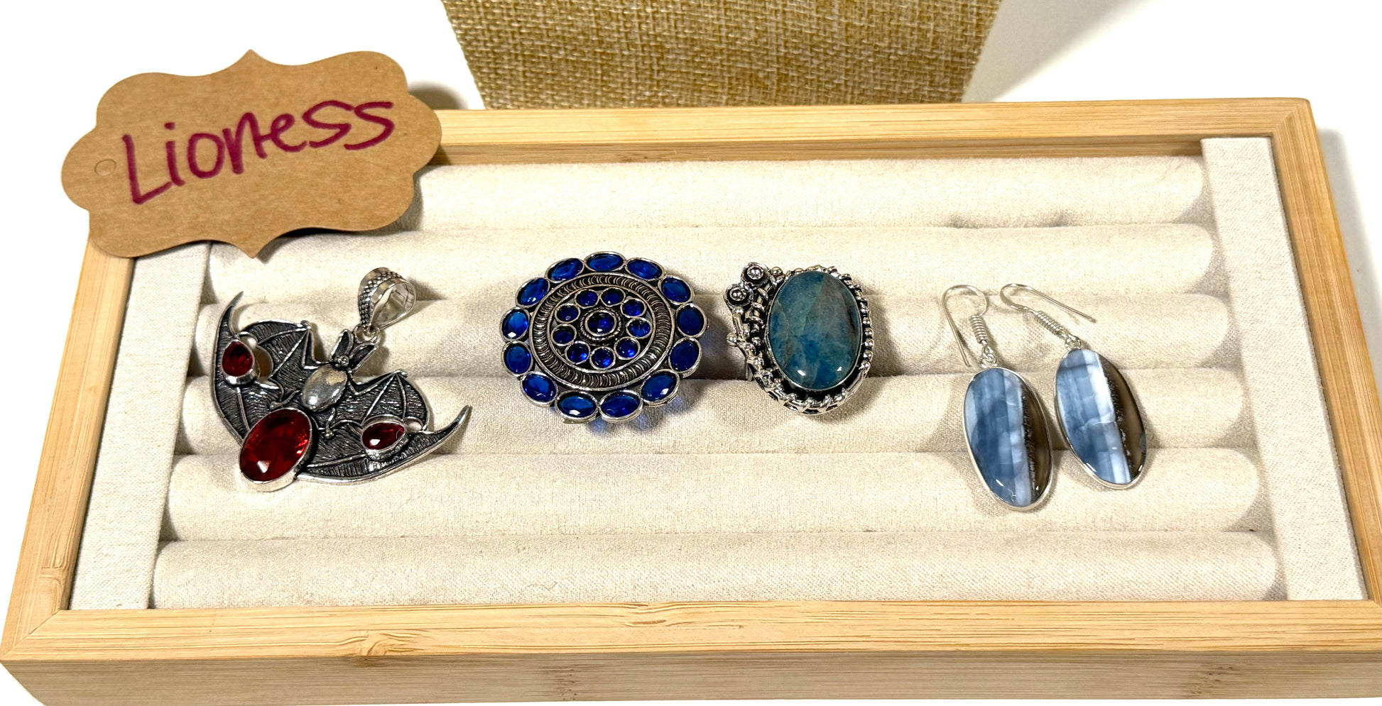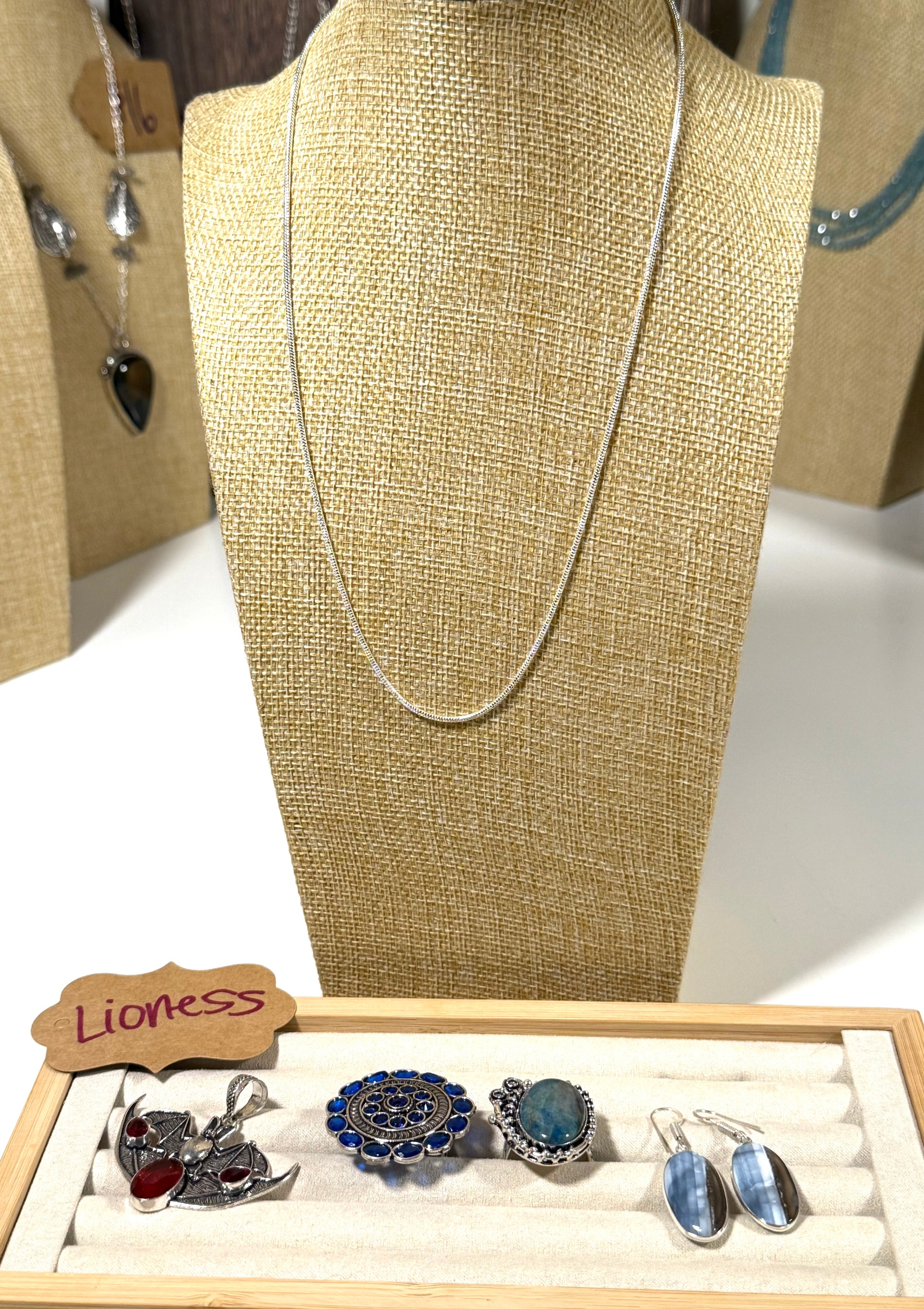 Bat pendant (12), mandala ring (14), apatite solid ring (16), owyhee dangles (13), 20” chain solid (3).