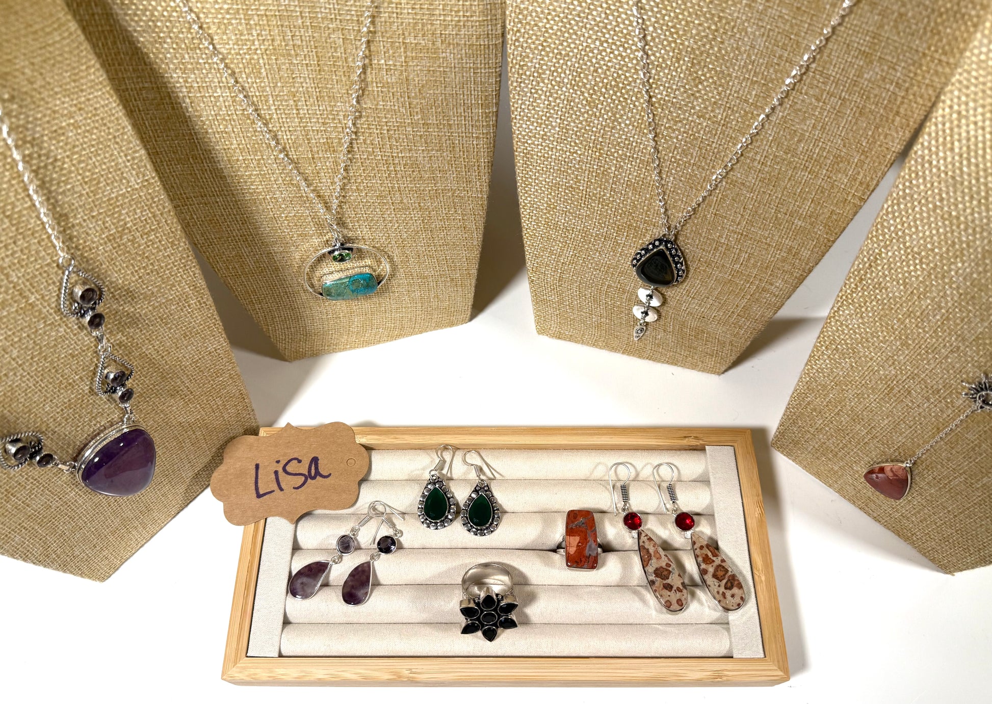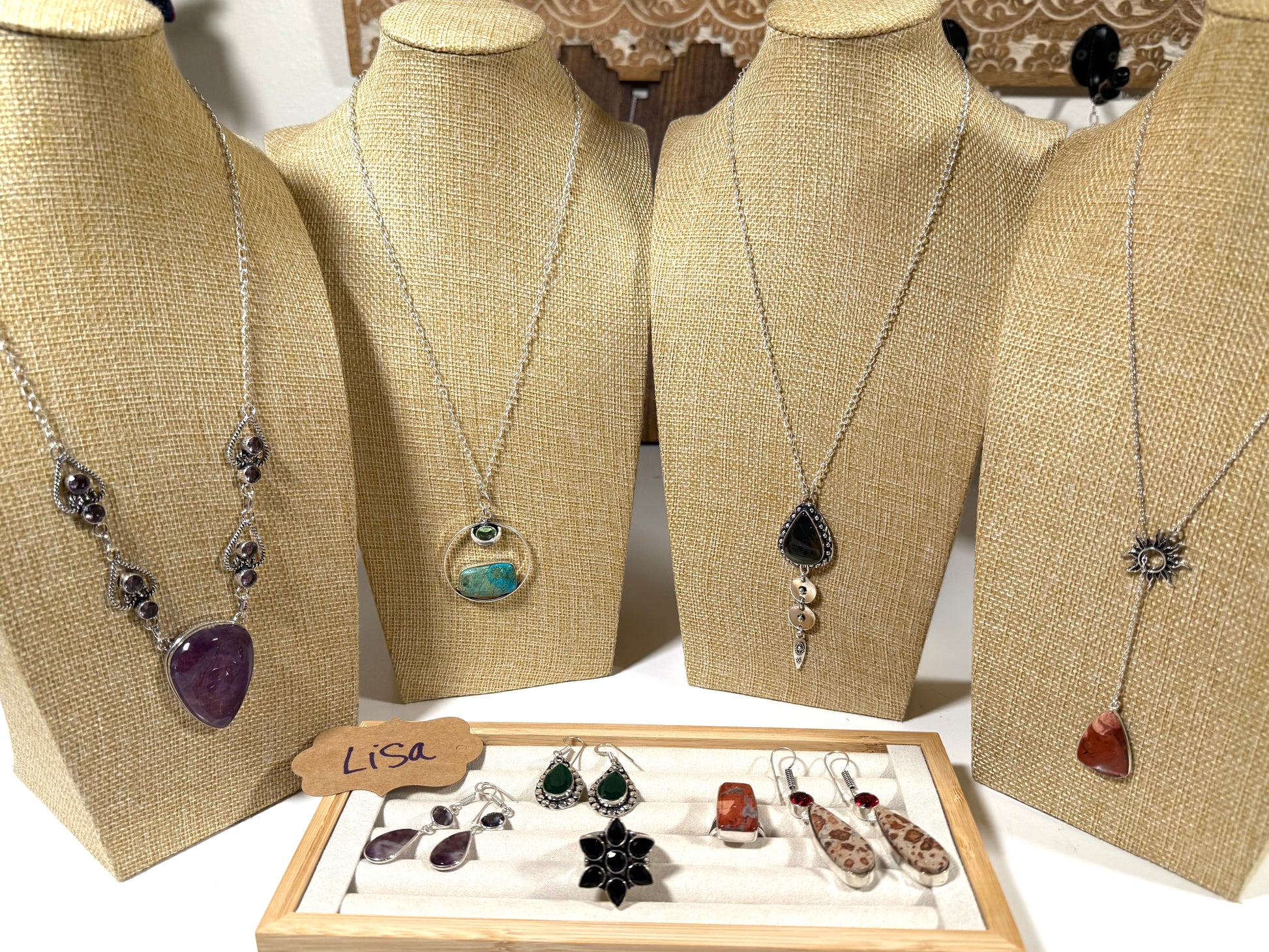 Amethyst necklace (15), chrysocolla necklace (13), tigers eye necklace (15), red Jasper (13), amethyst dangles (13), green onyx dangles (13), black onyx ss ring (16), red Jasper ring (14), asteroid Jasper dangles (12).