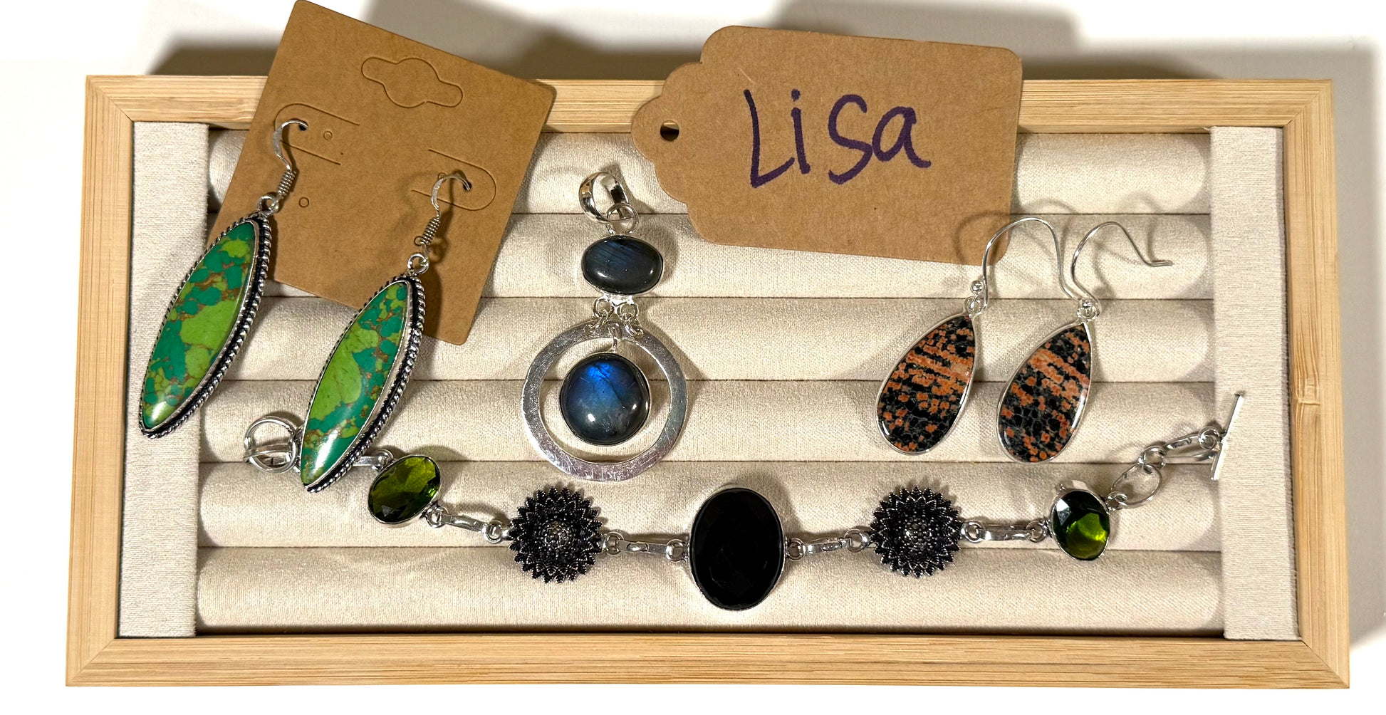 Copper turquoise dangles (10), labradorite pendant (12), red snowflake obsidian dangle (10), onyx and peridot bracelet (13).