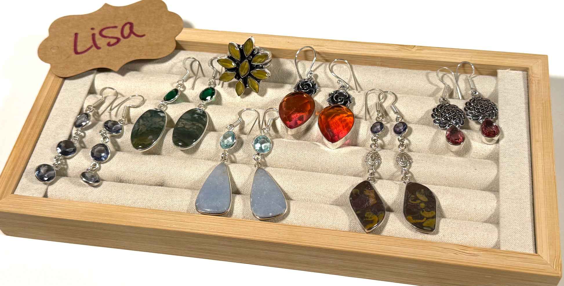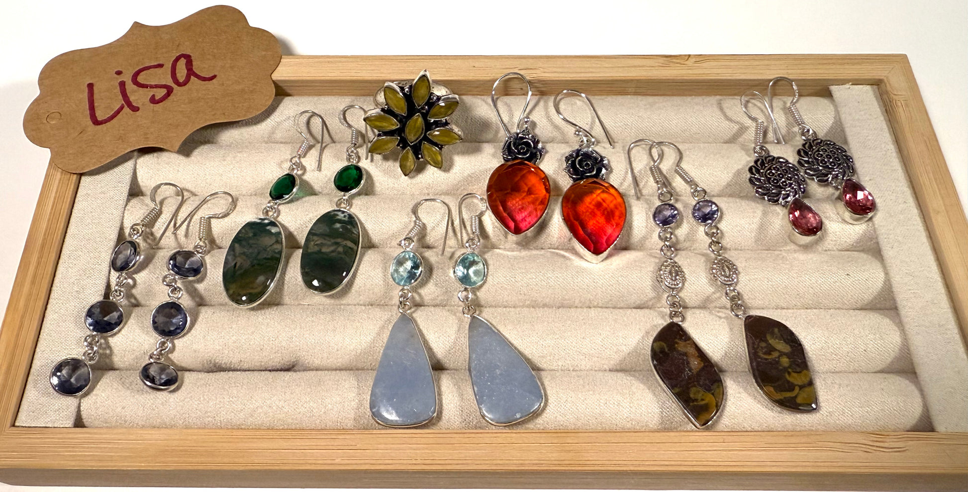 Topaz dangles solid silver (13), moss agate dangles (14), citrine ring (14), angelite dangles (14), tourmaline dangles (16), Jasper dangles (14), rubilite dangles (13).