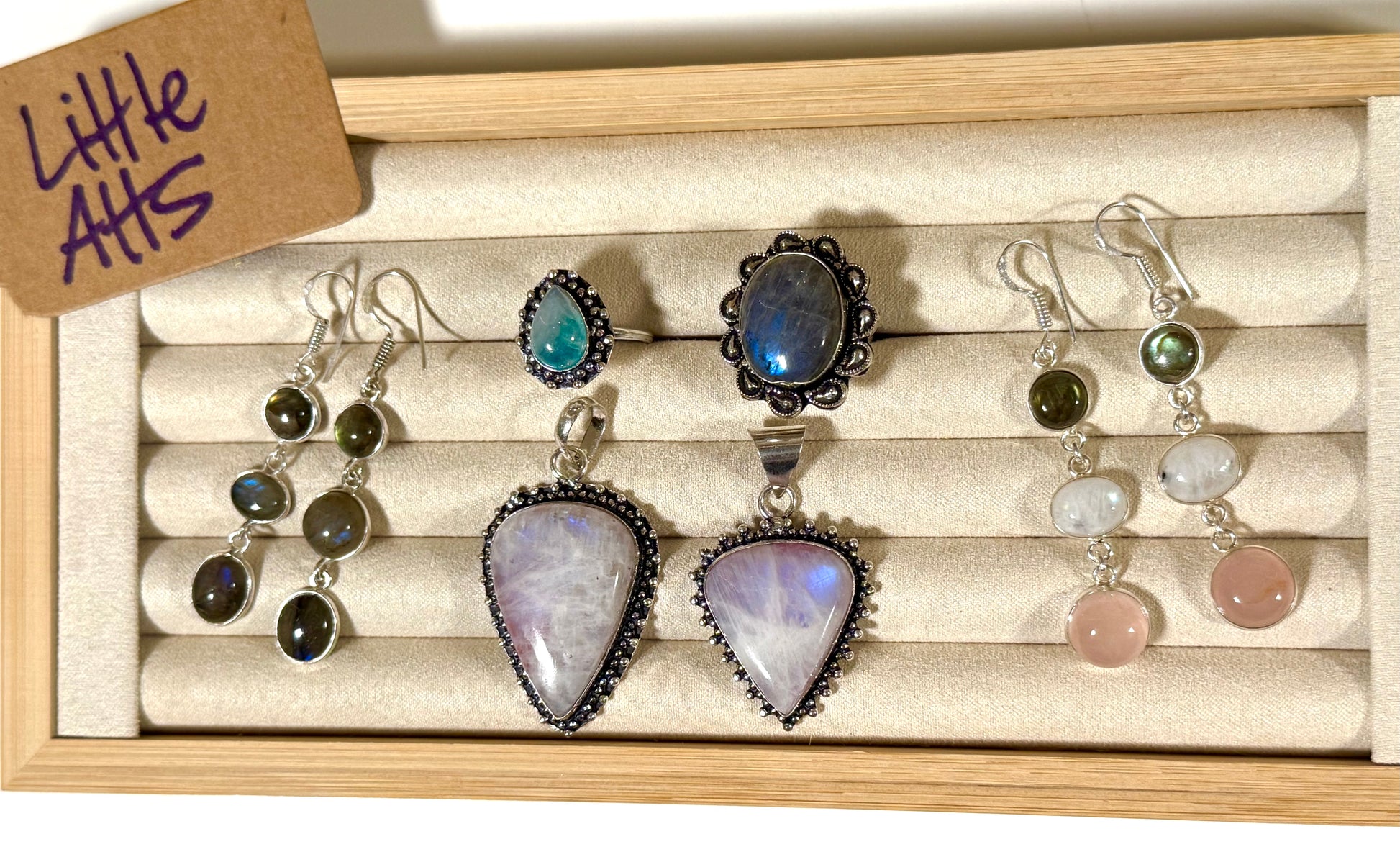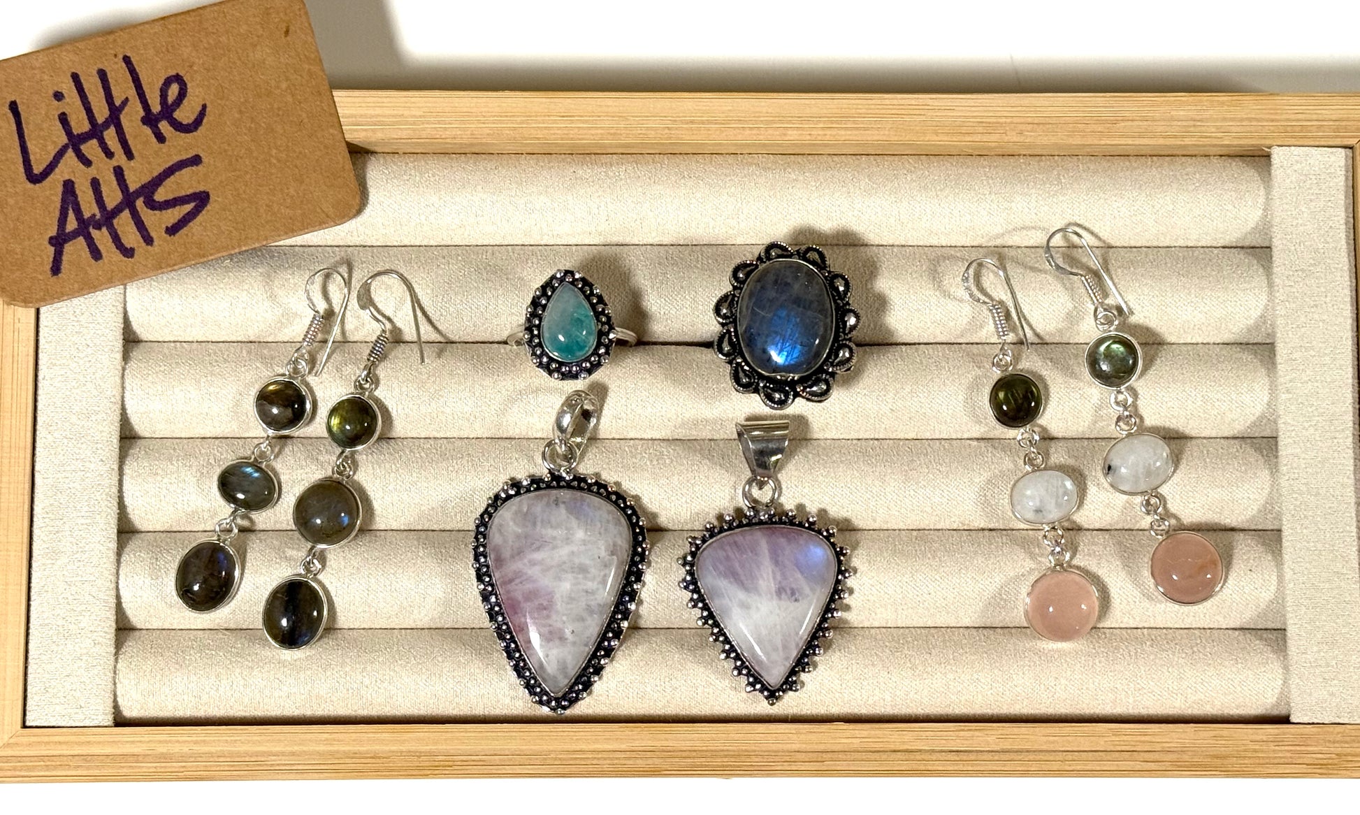 Labradorite dangles (13), aqua rainbow ms ring (14), solid silver lab ring (16), pink rainbow ms pendant (12), pink rainbow ms pendant (12), triple stone dangle (13).