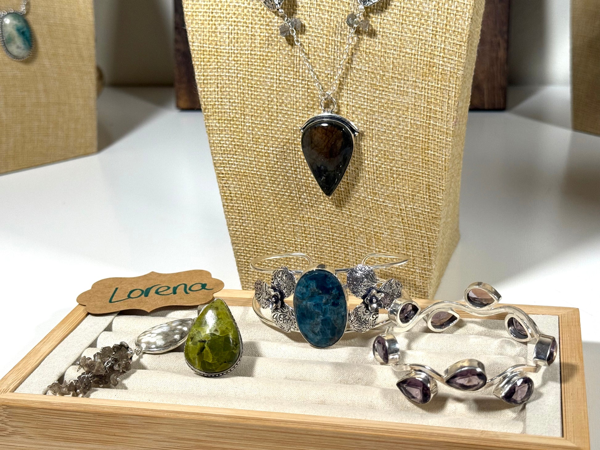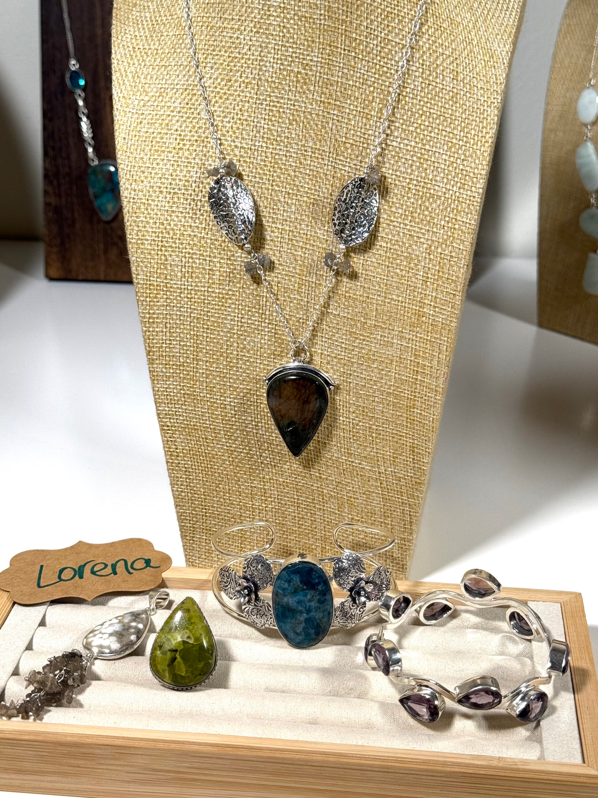 Labradorite necklace (16), oj pendant (15), blue apatite ss cuff (22), amethyst ss cuff (22).