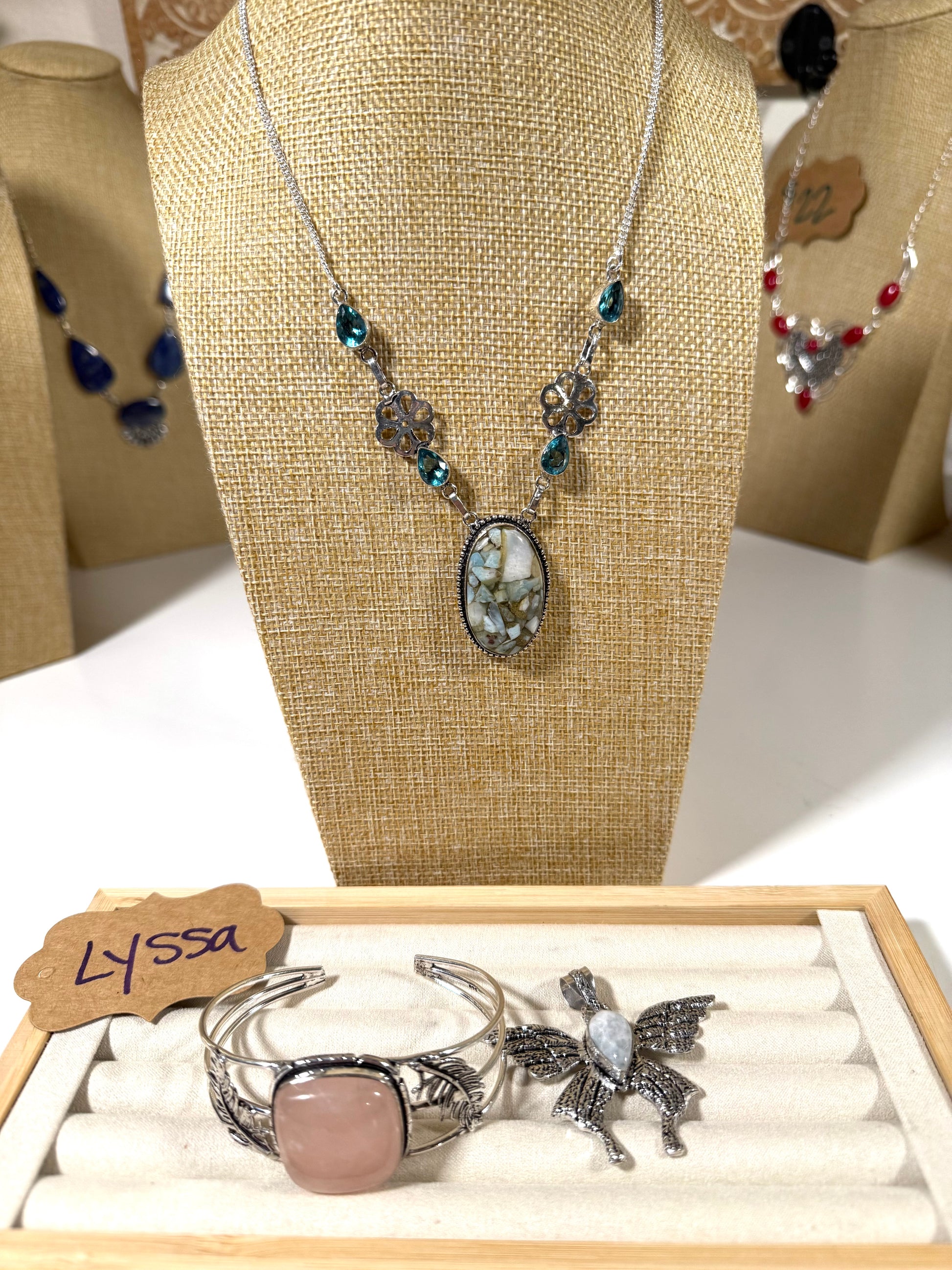 Larimar copper topaz necklace (12), rose quartz cuff (12), rainbow ms pendant with wings (11).