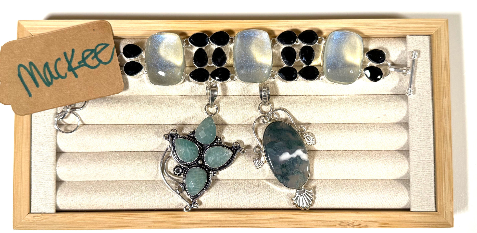 Rainbow ms onyx bracelet ,solid ss, (22), amazonite pendant solid ss (19), Indian moss agate pendant solid ss (16).