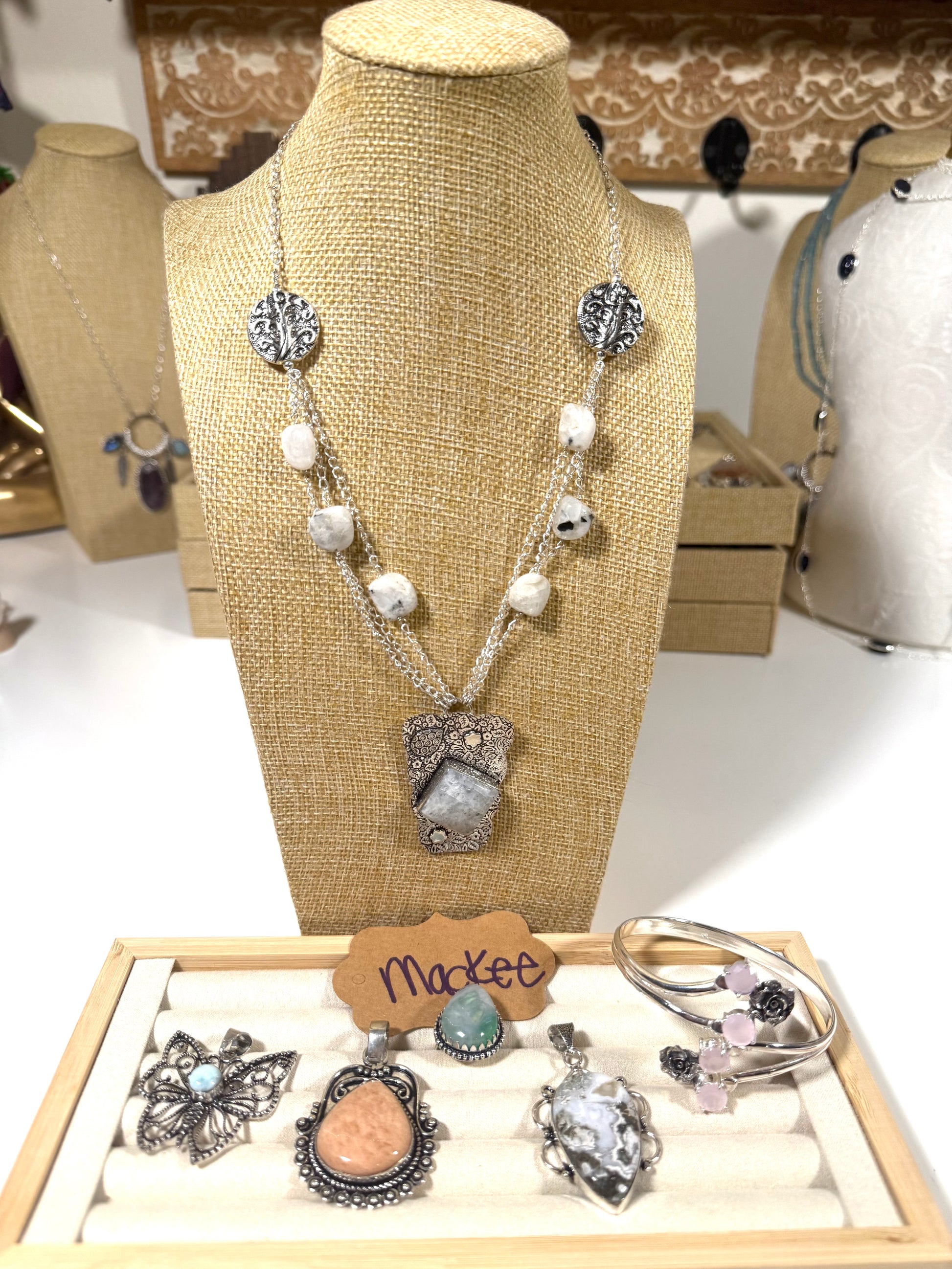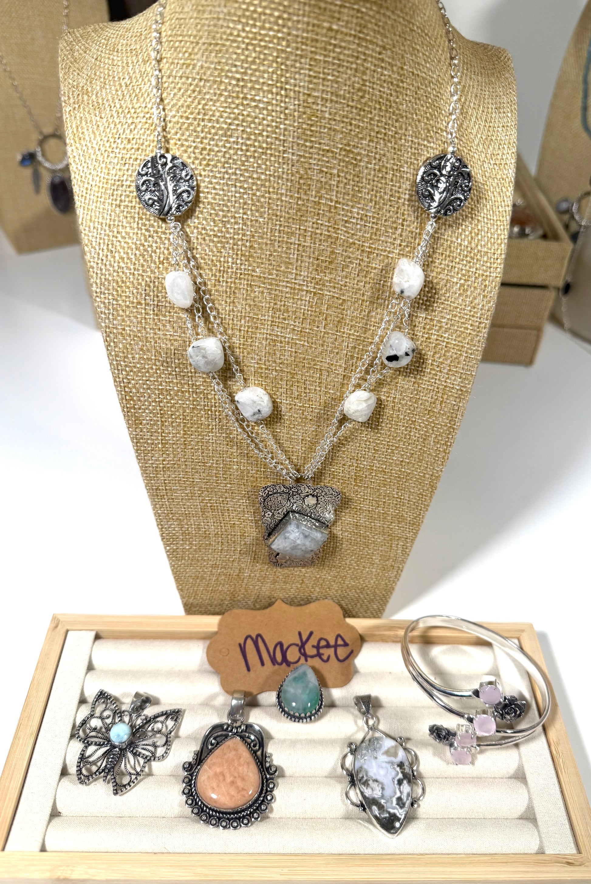 Rainbow ms necklace (16), Larimar pendant (12), orange aventurine pendant (18), rainbow ms ring (14), ocean Jasper pendant (12), rose quartz solid bangle (19).