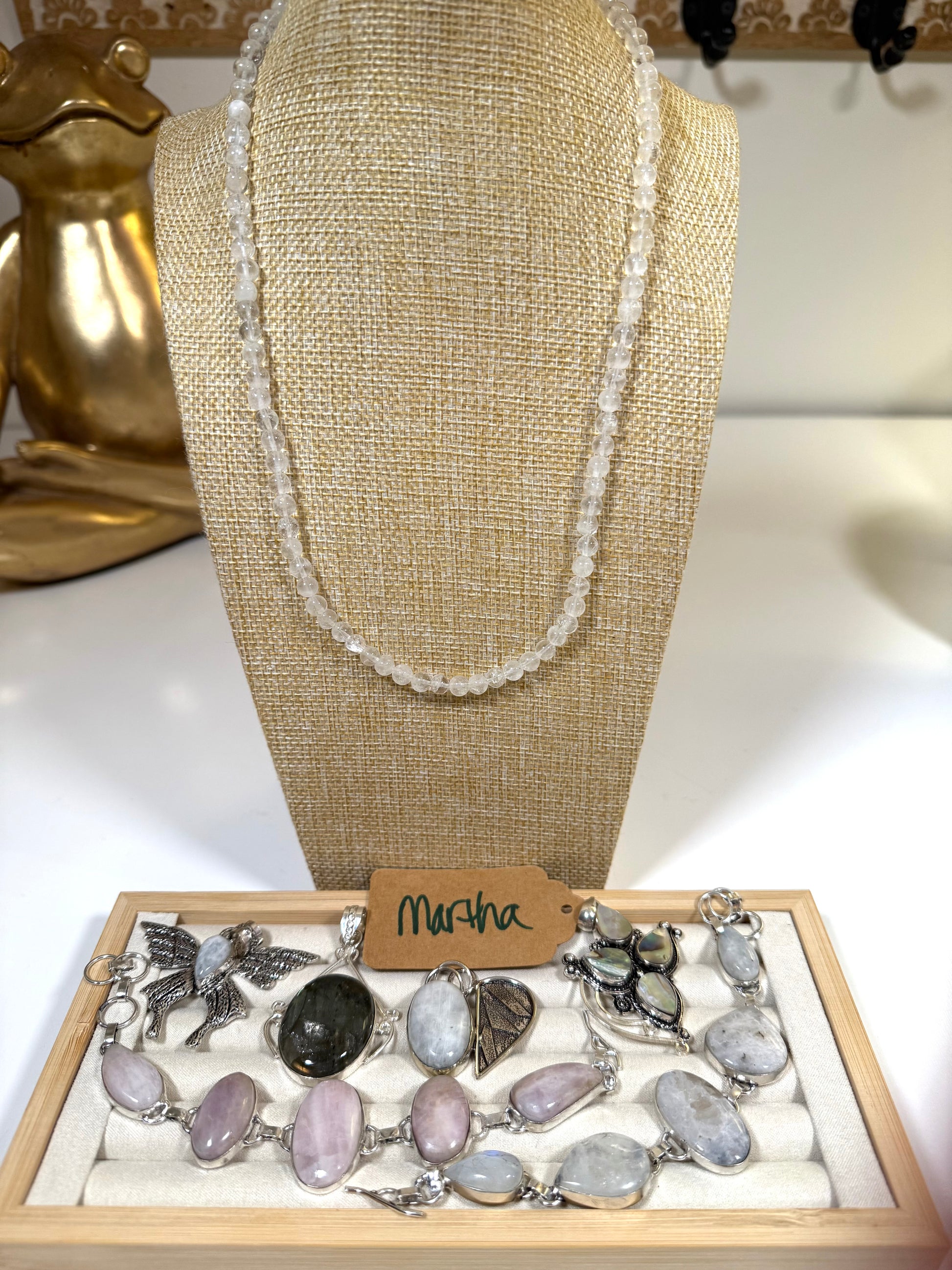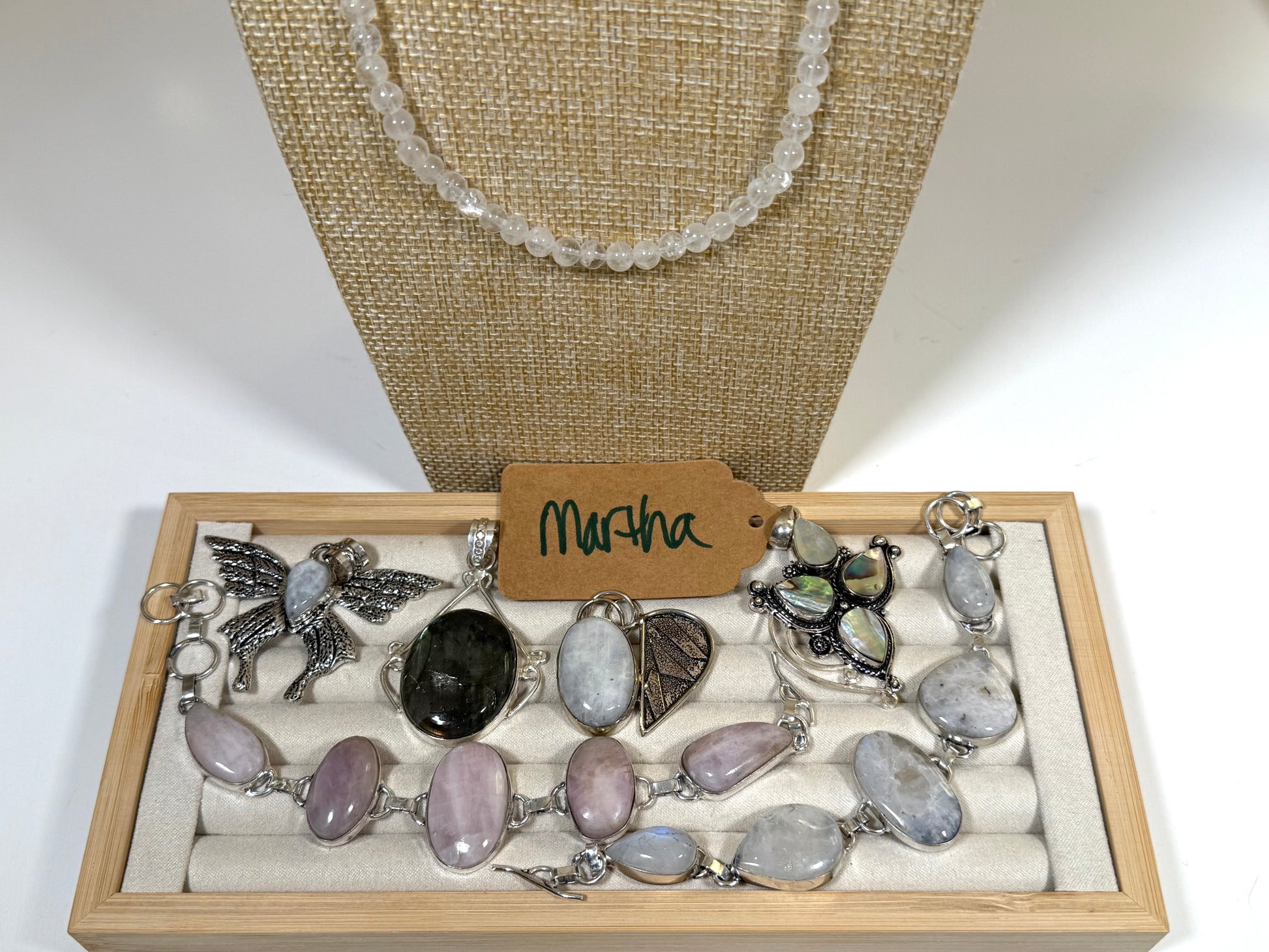 Beaded necklace (12), rainbow ms pendant (10), labradorite pendant solid ss (12), rainbow ms pendant (10), abalone pendant (12), kunzite bracelet (12), rainbow ms bracelet (15).