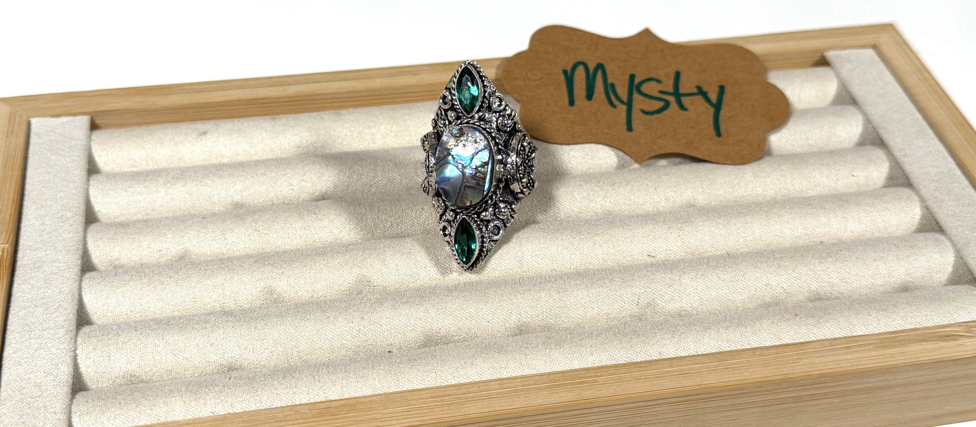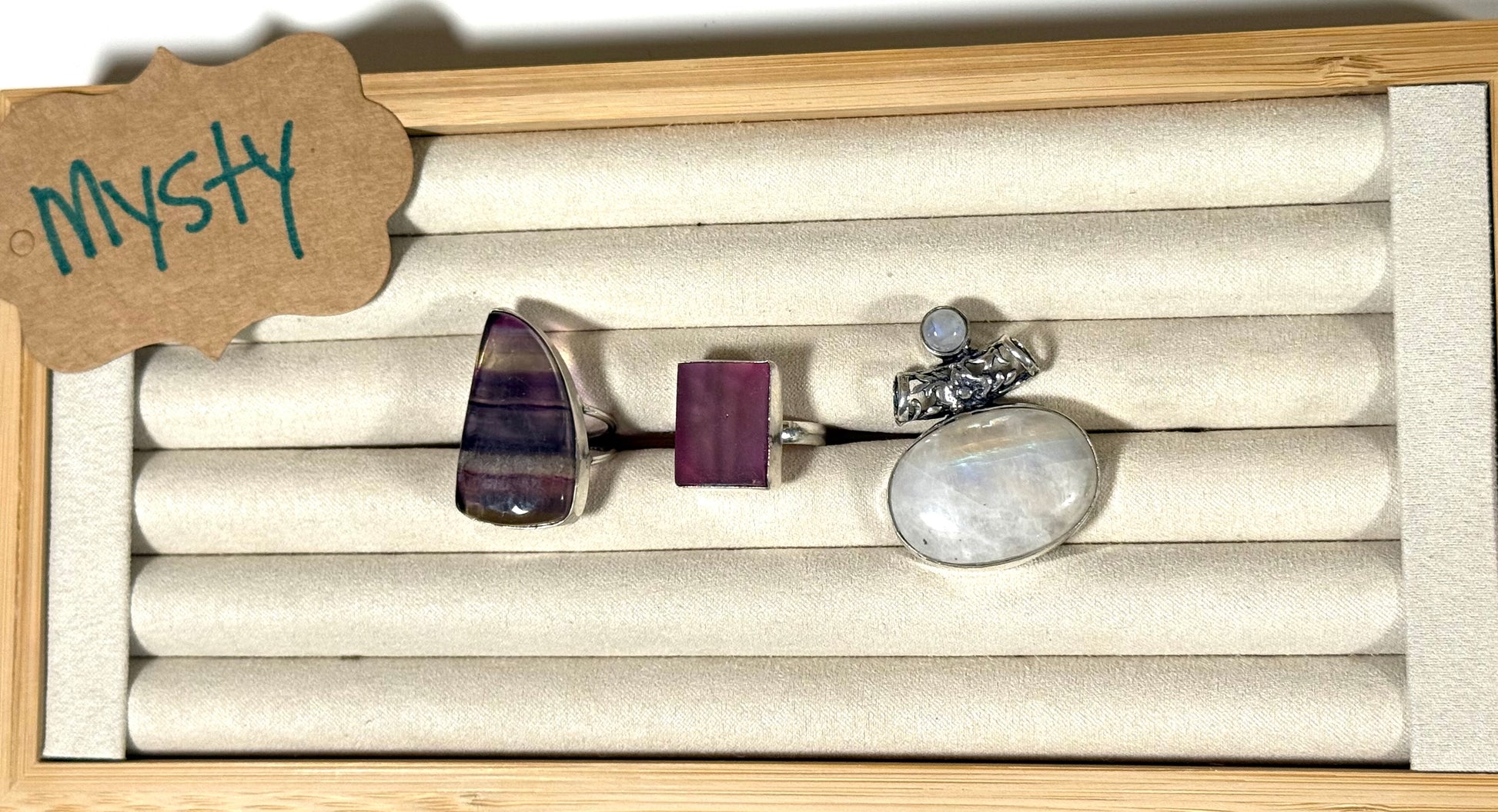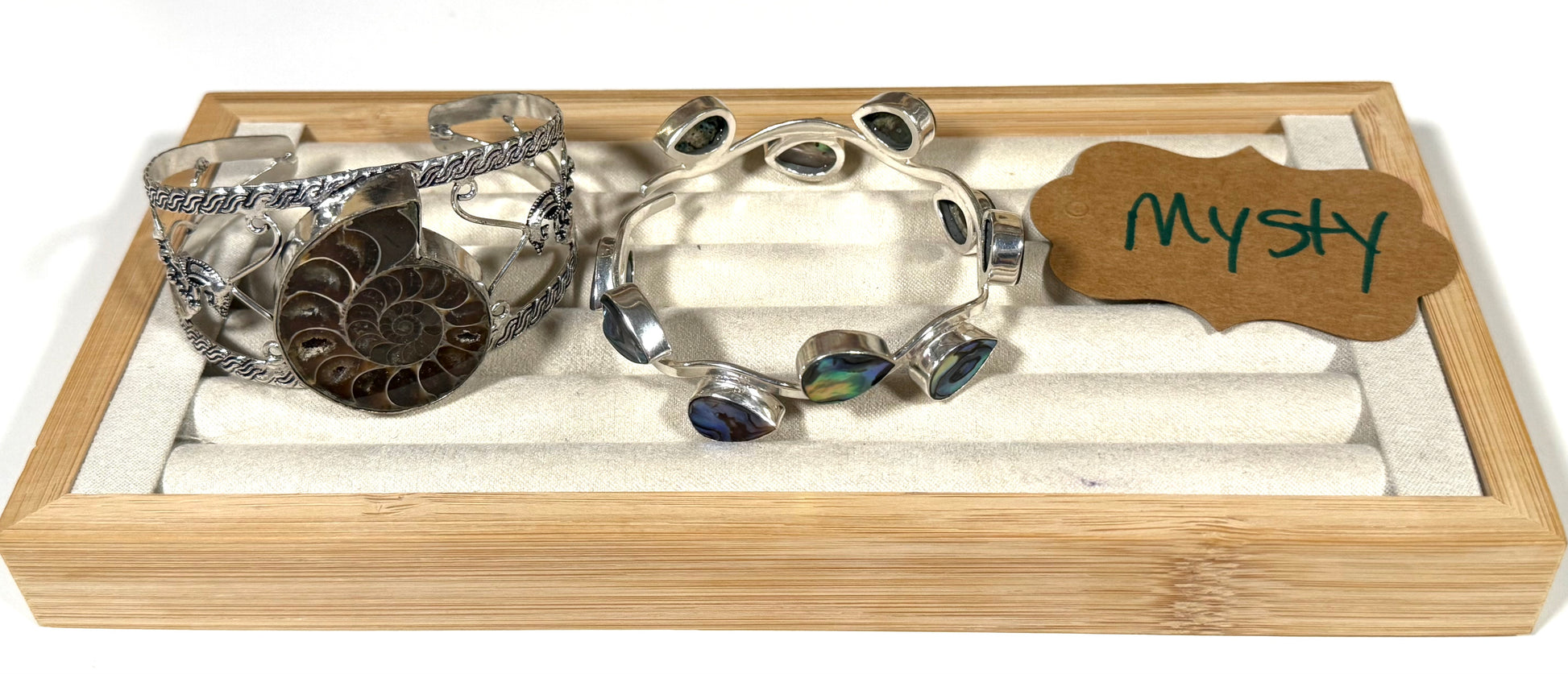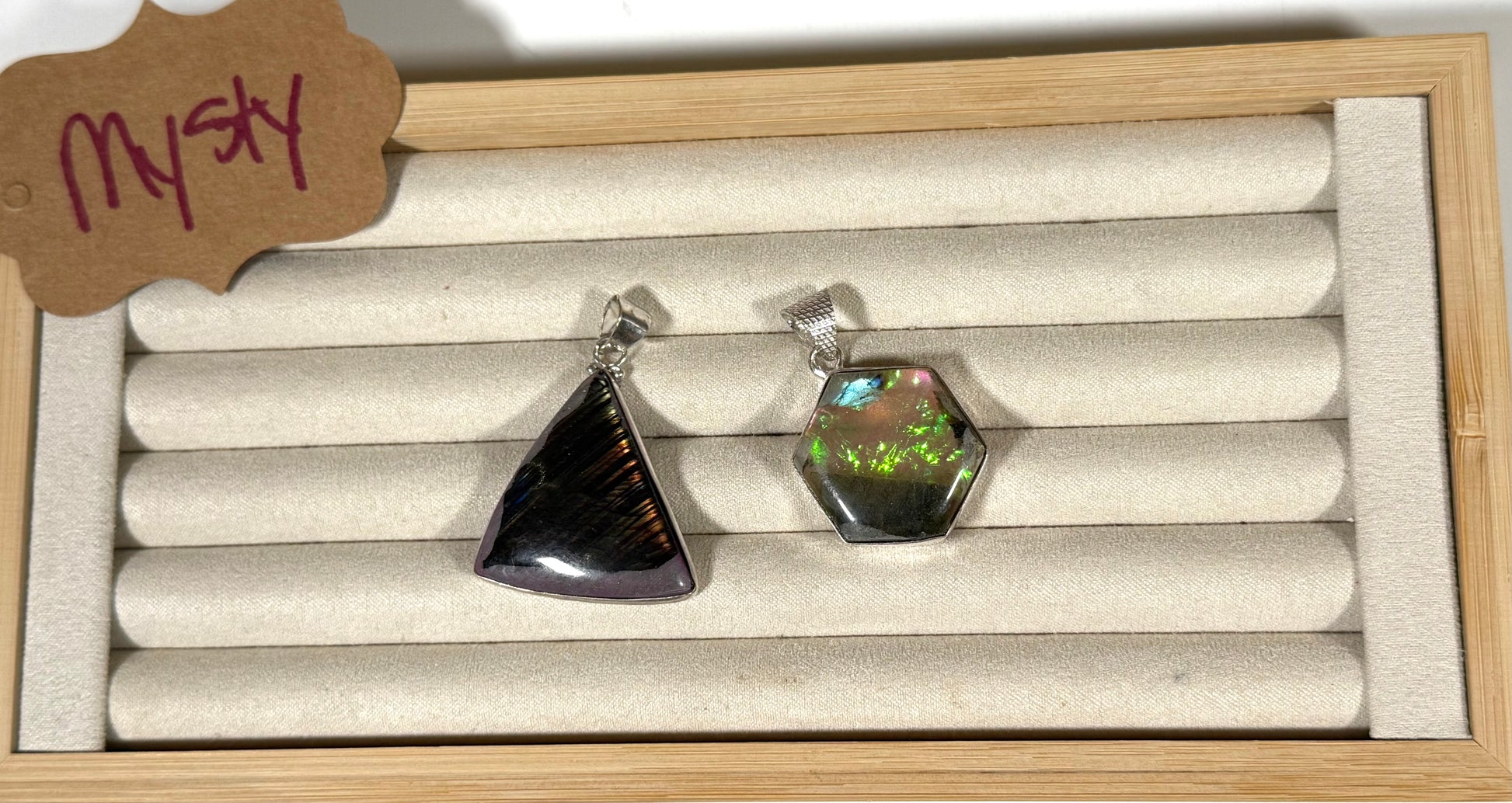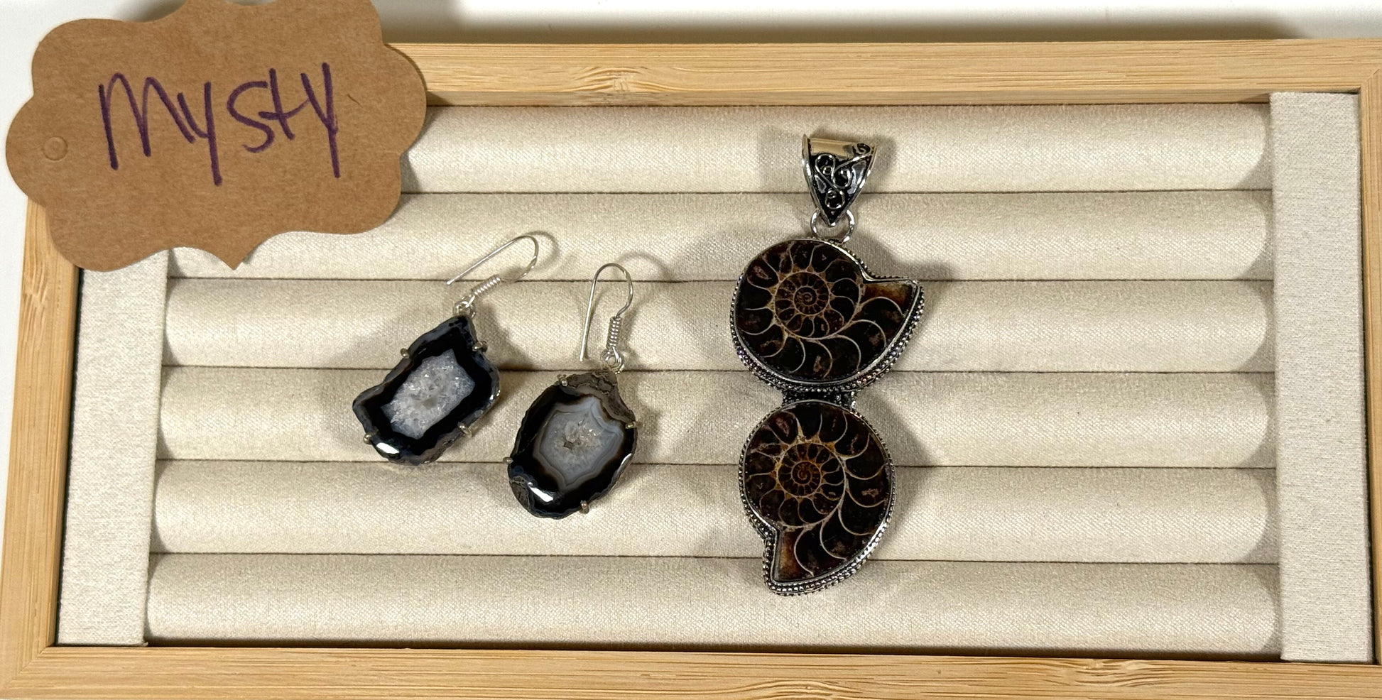 11/2: pink lab ring (14), shark fin fluorite (14), rainbow ms pendant (12). 11/5: serpentine (10), evil eye (10), Indian moss (10), Indian moss dangles (9), bumblebee (9). 11/8: abalone studs solid silver (18). 11/17: ammonite (19), abalone solid ss (22). 11/20: abalone triple stone solid ss (19). 11/23: ruby and moss agate (20). 11/30: lab pendant (11), ammolite pendant (11). $38 for items already mailed. 12/12: ammonite pendant (19), agate dangles (14).