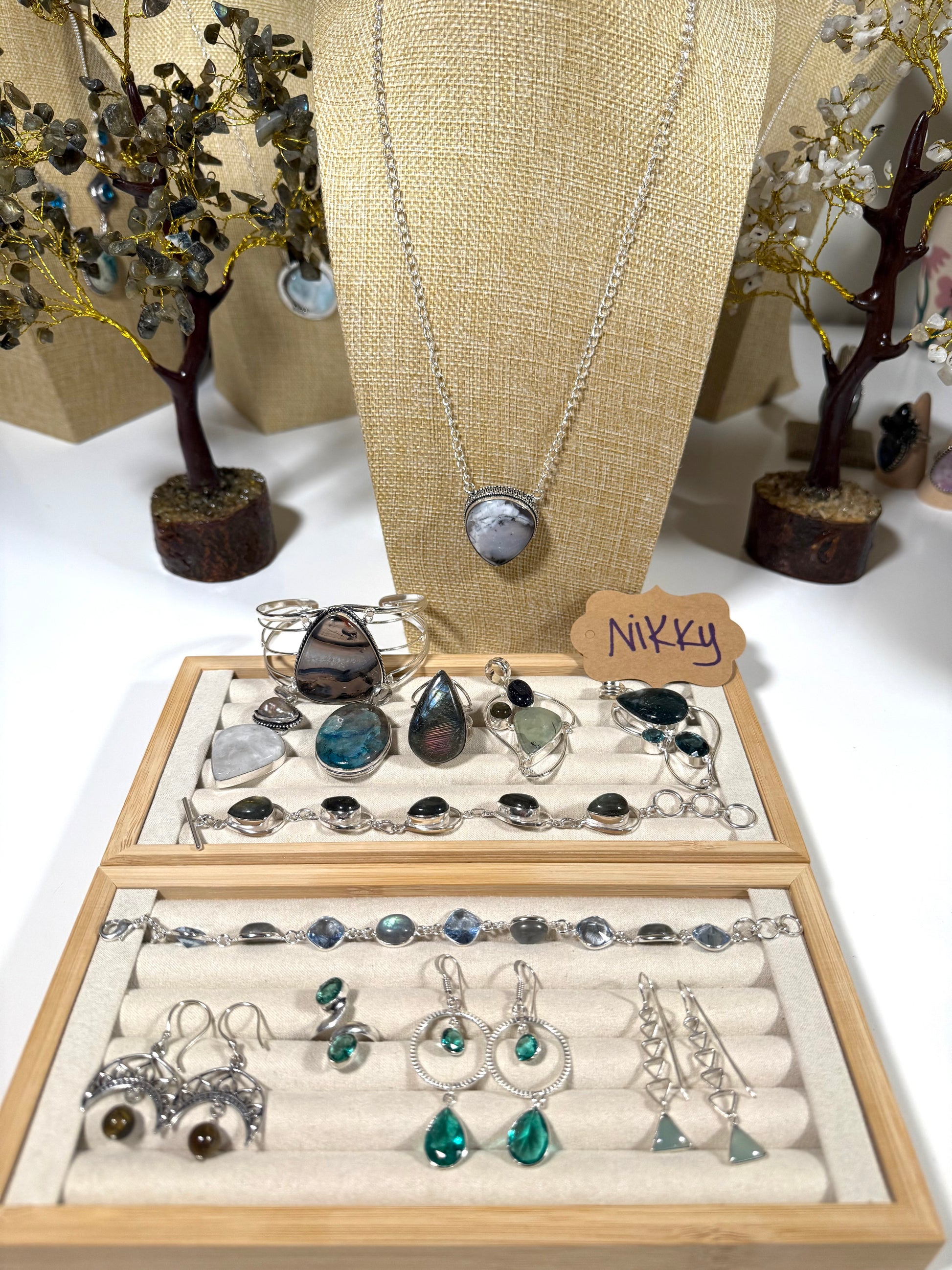 Dendritic opal necklace (13), tube agate cuff ss(22), rainbow ms pendant (15), chrysocolla pendant (13), labradorite ring (14), moss pendant ss(16), moss agate pendant ss(16), labradorite bangle ss(20), tigers eye dangle ss (16), topaz adjustable (14), topaz dangles (14), aquamarine dangles ss (16), lab topaz bangle (20).