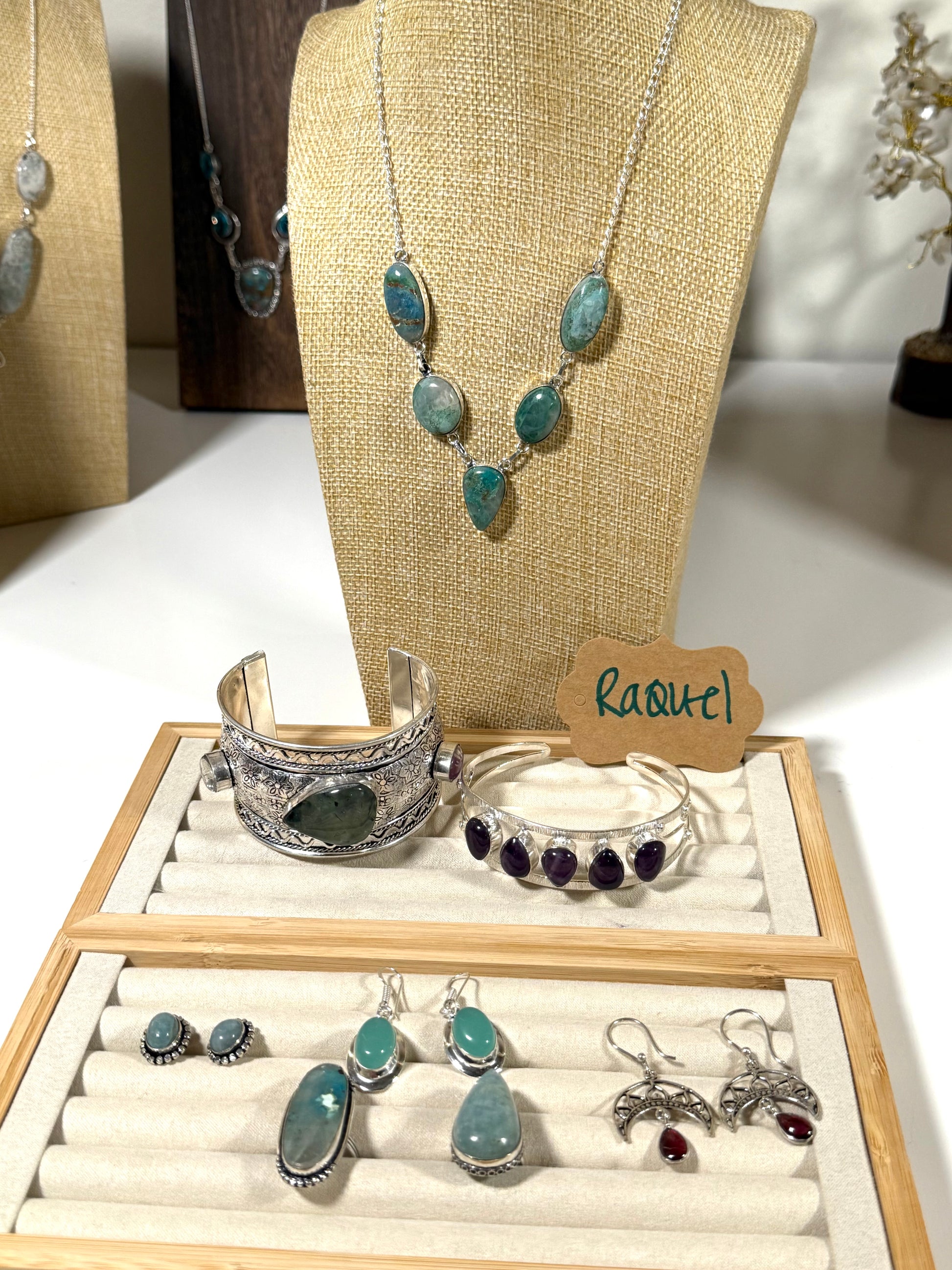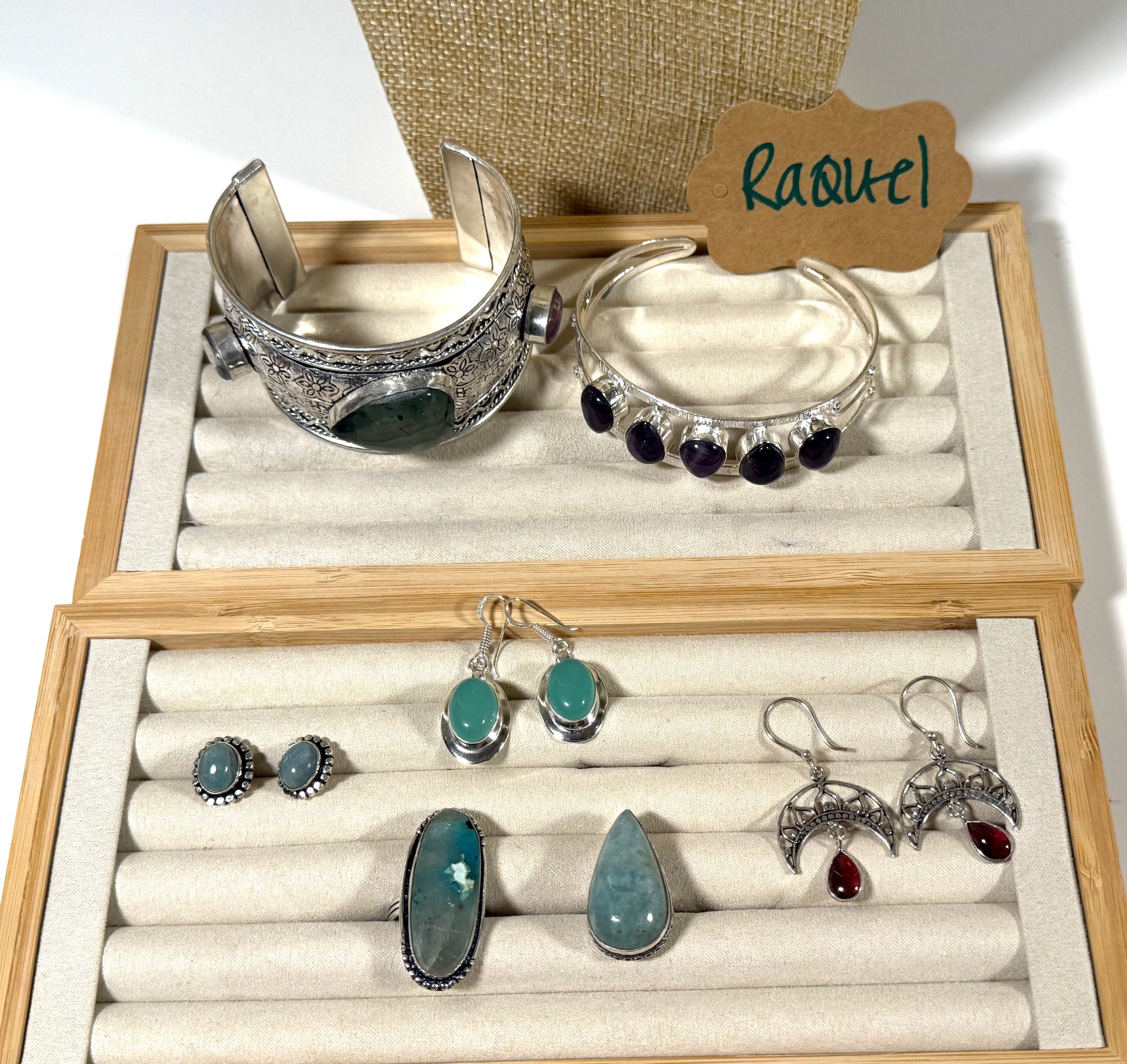 Qq necklace (15), prehnite cuff (15), amethyst cuff 22), amazonite studs (13), aqua ss dangles (16), qq ring (14), aquamarine ring (14), garnet dangles (16).