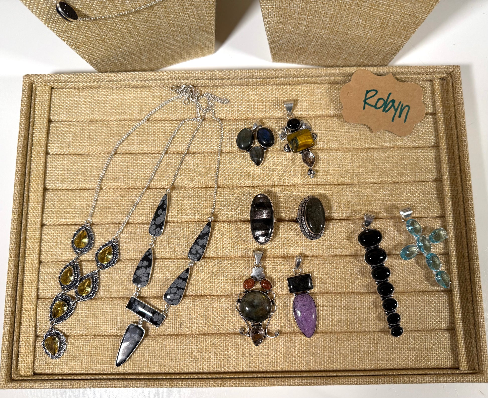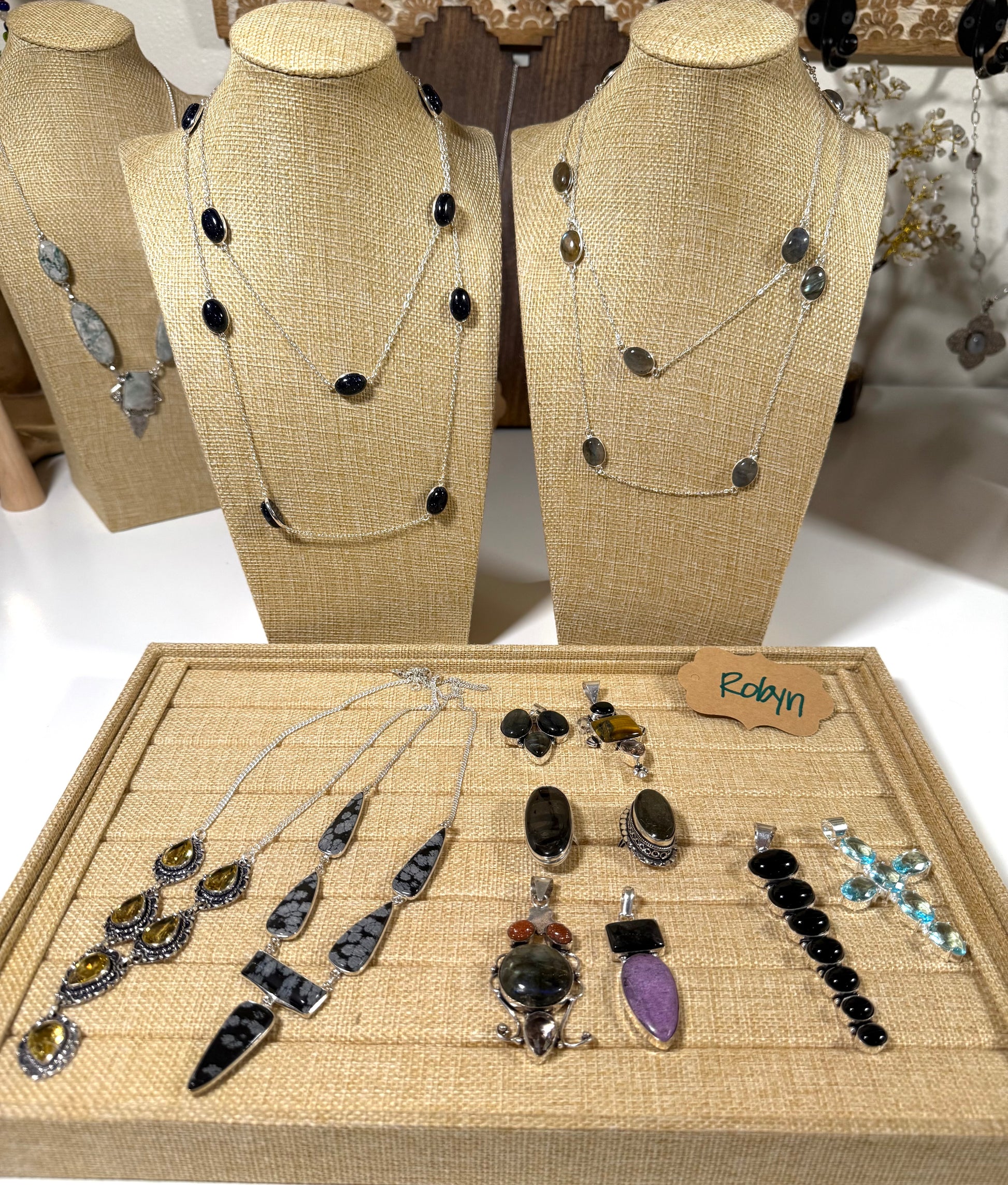 Lab 36” ss necklace (22), purple sandstone 36” (22), citrine (15), snowflake obsidian (15), lab pendant (14), tigers eye ss pendant (16), Hypersthene ring (14), silver obsidian ring (16),labradorite ss pendant (16), Hypersthene purpurite pendant (14), black onyx ss pendant (19), aqua cross ss(16).