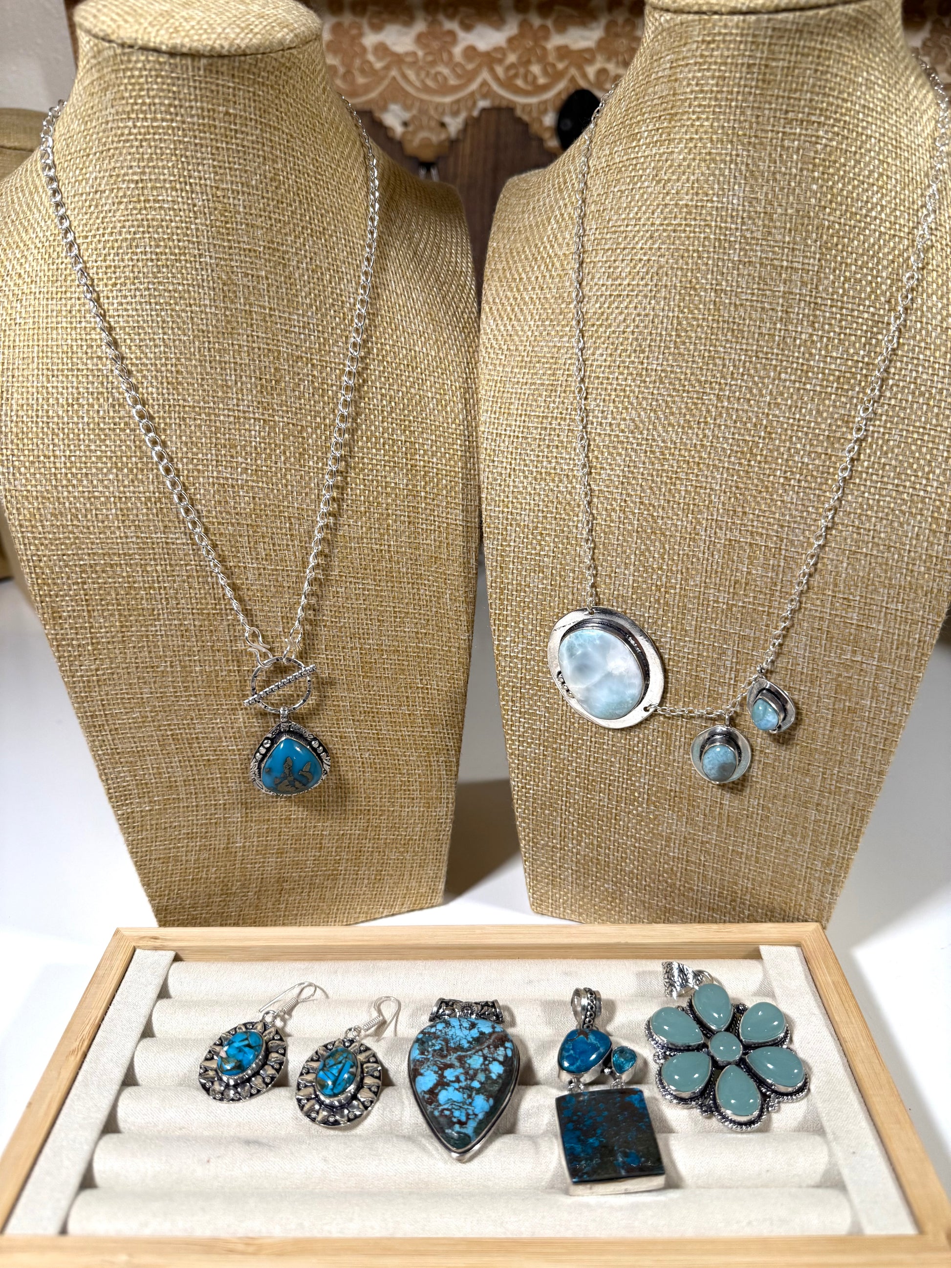 Turquoise necklace (12), Larimar necklace (12), copper turquoise dangles (12), turquoise pendant (12), turquoise pendant (12), aqua chalcedony pendant solid sterling silver (19).