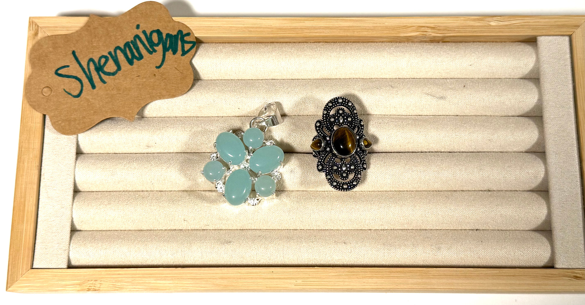 Aqua chalcedony bauble ss (19), ss tigers eye ring (19).