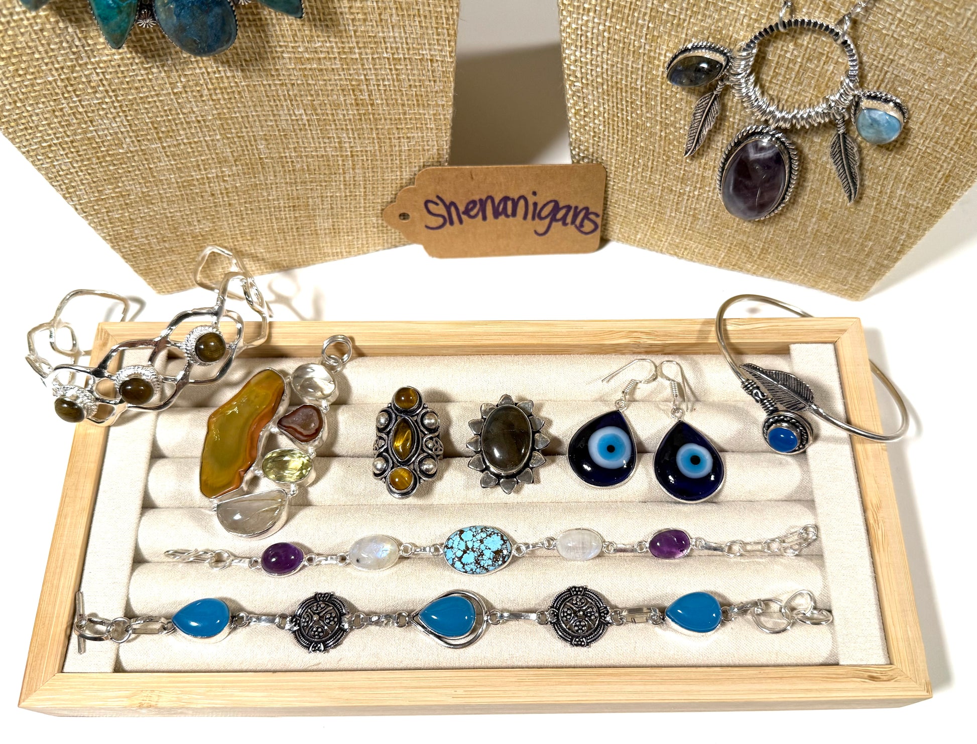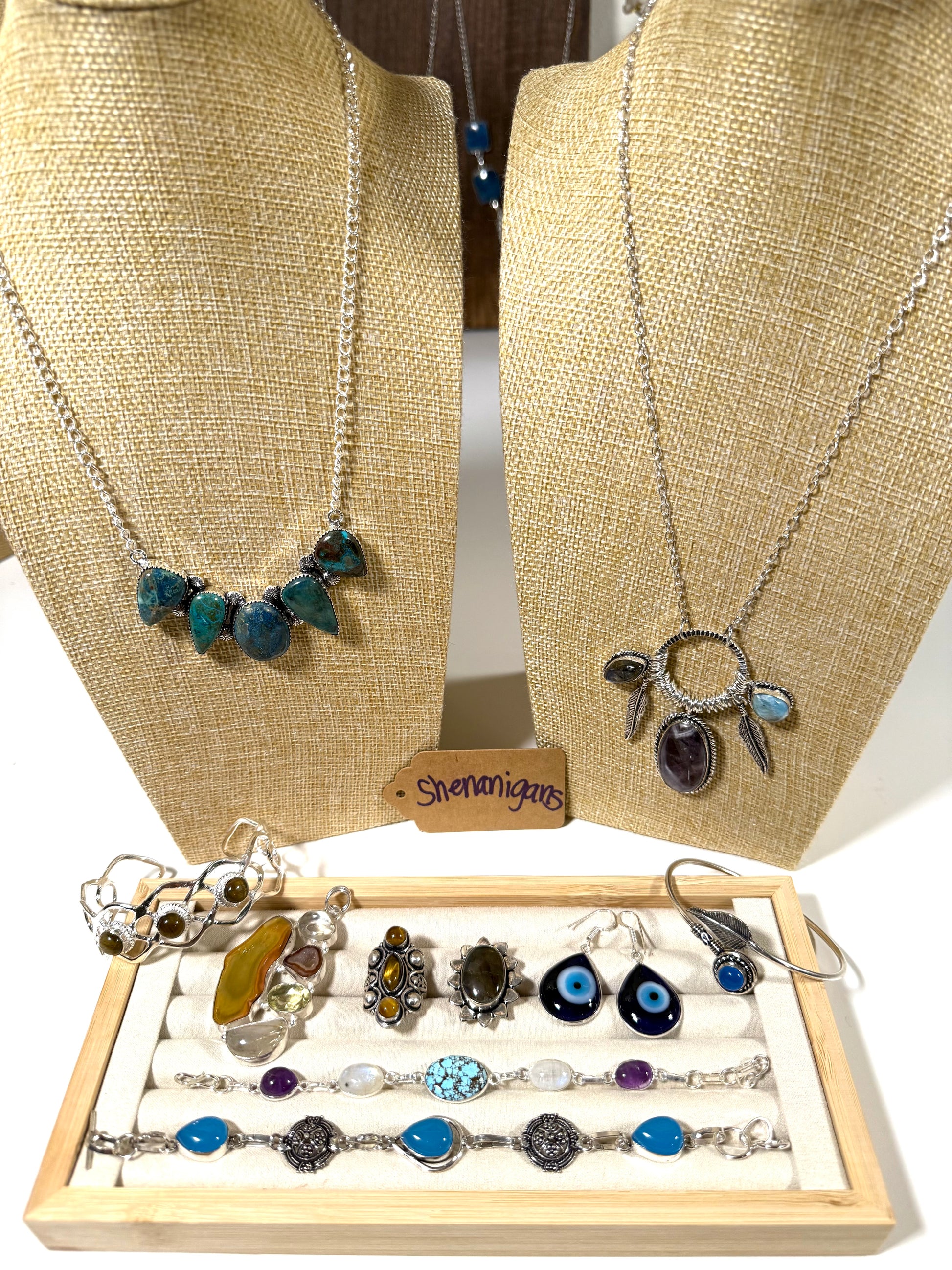 Chrysocolla necklace (12), amethyst necklace (15), tigers eye cuff (21), multi stone pendant (13), solid tigers eye ring (16), solid lab ring (16), evil eye dangle (10), blue chalcedony bangle (12), turquoise bangle (13), blue chalcedony bracelet (13).