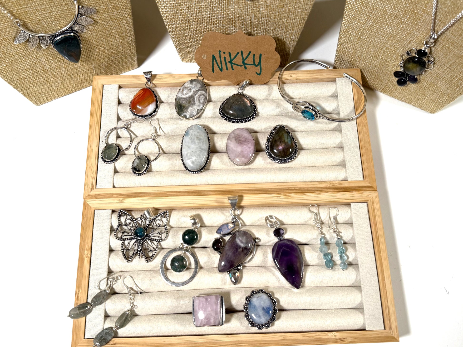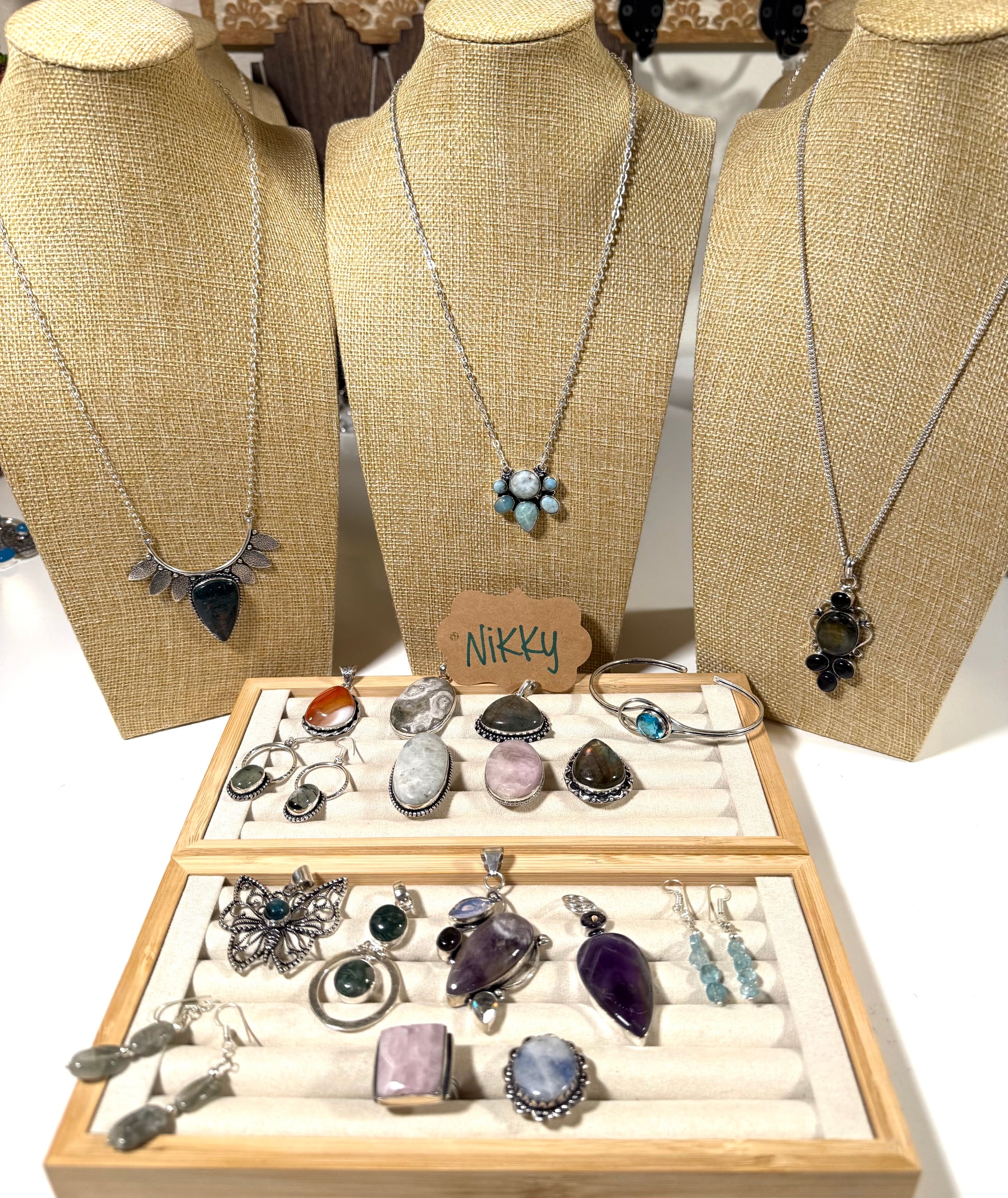 BLoodstone necklace (10), Larimar necklace (12), labradorite ss (15), sardonyx (10), ocean Jasper (11), lab pendant (11), Topaz bangle (10), prehnite dangles (12), rainbow ms ring (13), lepidolite ring (13), lab ring (13), butterfly pendant (10), moss agate (12), ss amethyst (15), amethyst (12), blue quartz (12), prehnite dangles (12), lepidolite (13), rainbow ms (13).